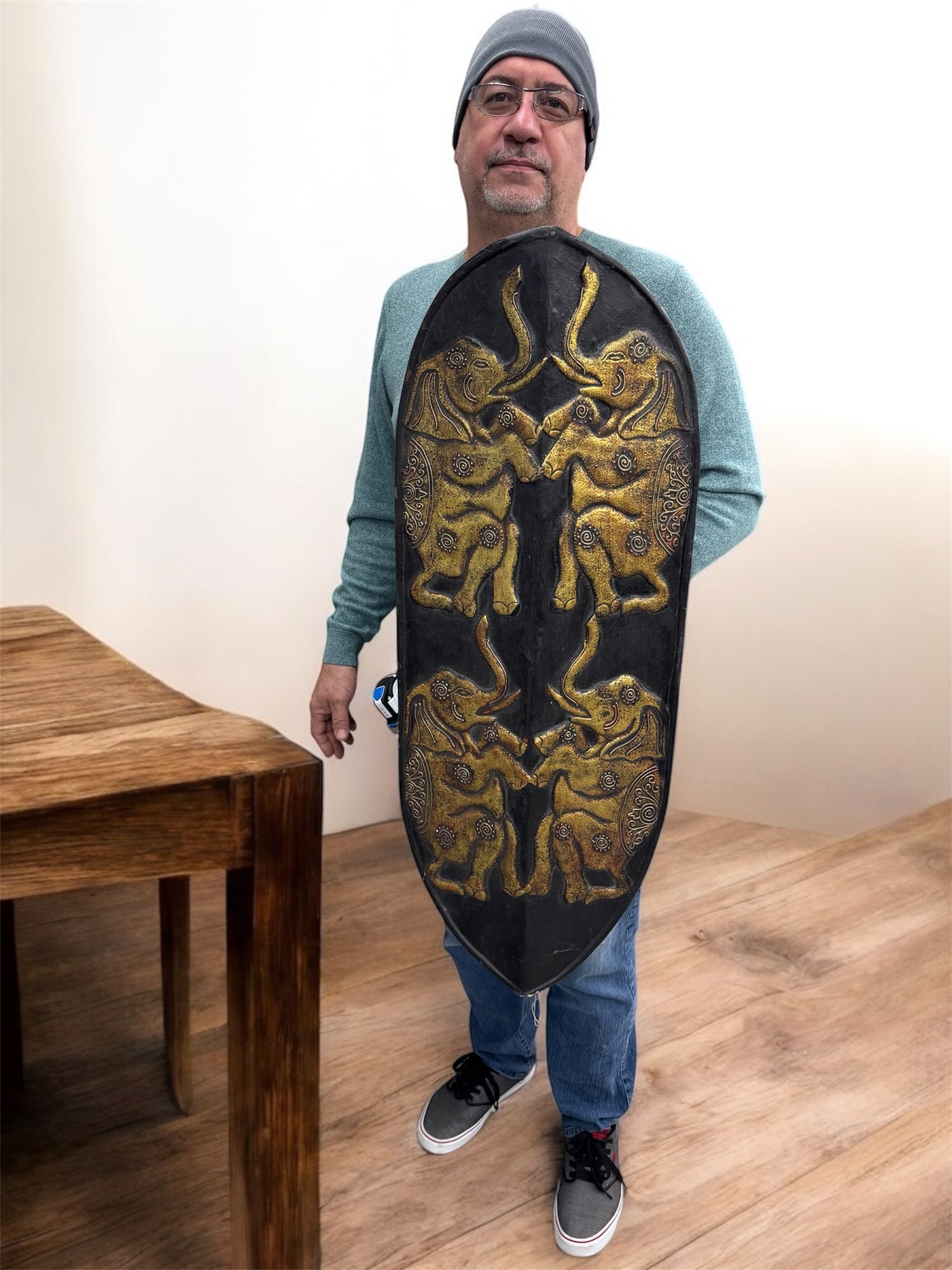 Large wood wall art, black and gold design. Good condition.