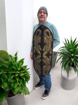 Large wood wall art, black and gold design. Good condition.