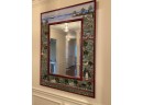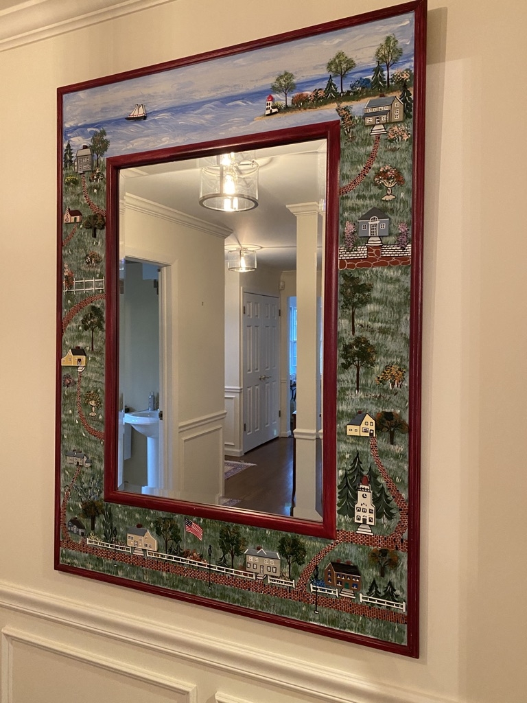 Beautiful and unique painted framed mirror depicting abstract Nantucket scene. Red painted wood framing mirror and entire piece.