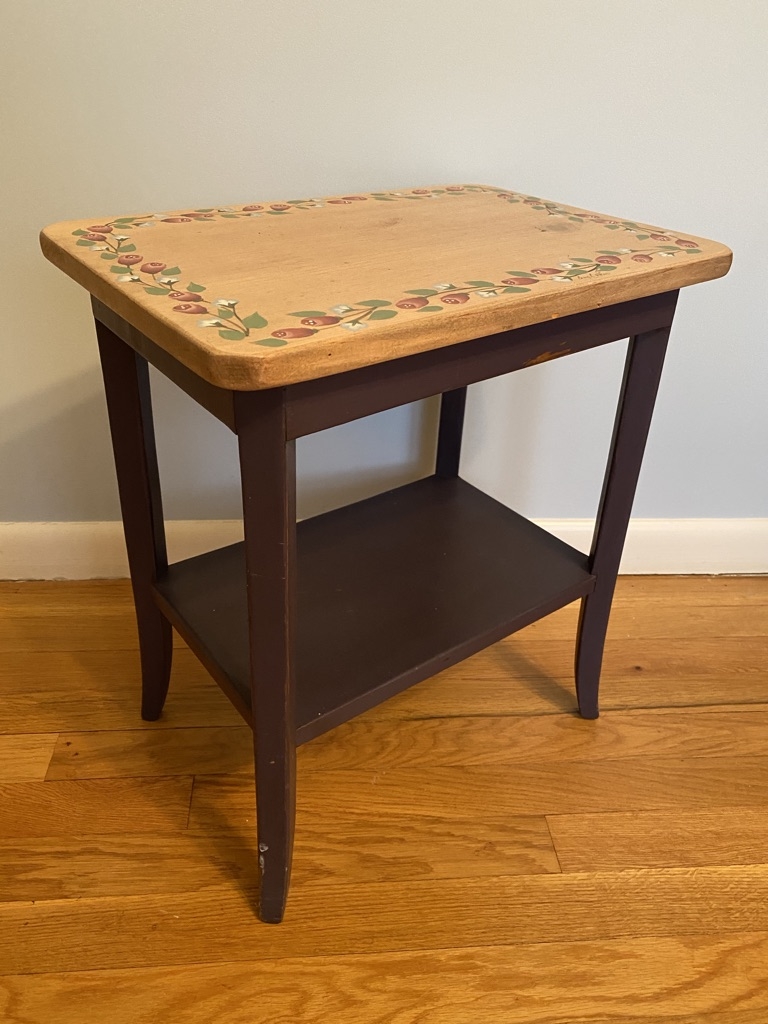 Unique occasional table with wood top, border painted in floral pattern. Signed. Single lower shelf. Shows some signs of wear, as shown.