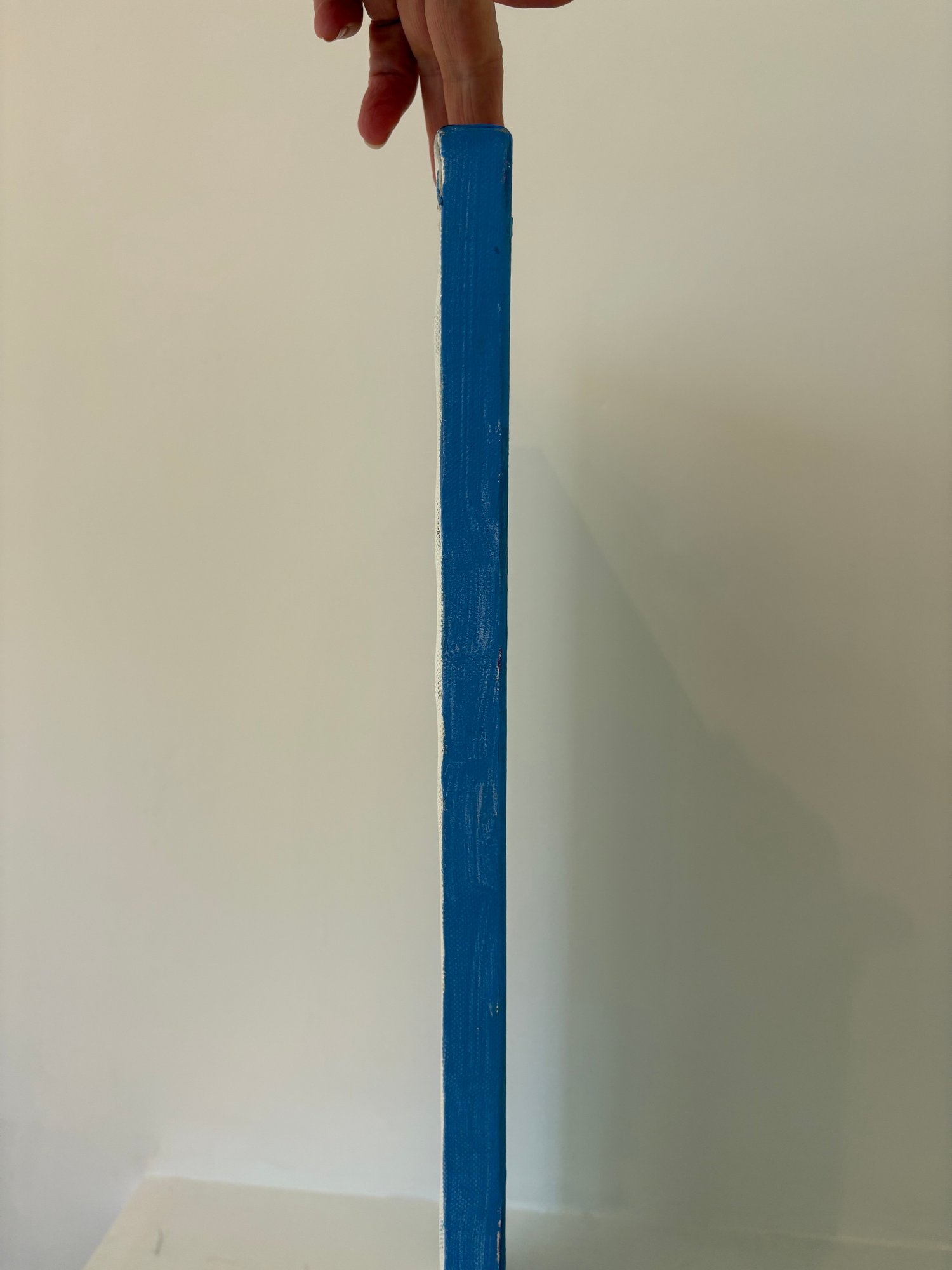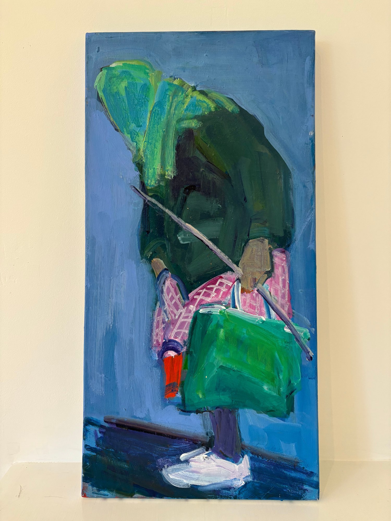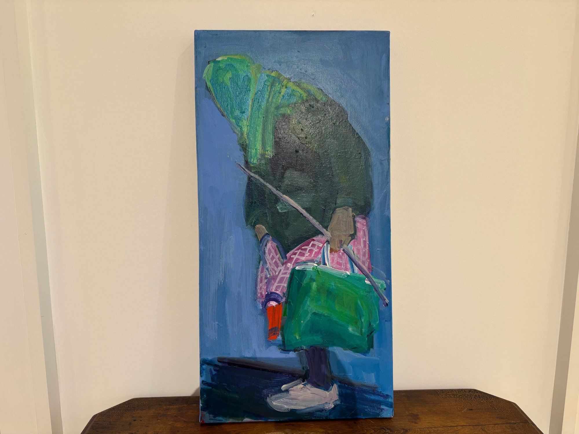 This painting features a striking use of color, with a dominant blue background contrasting with the greens of the figure's clothing and bag, and the pink and white of the skirt.