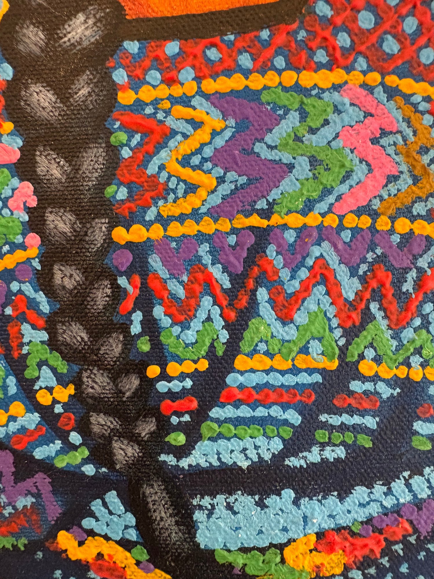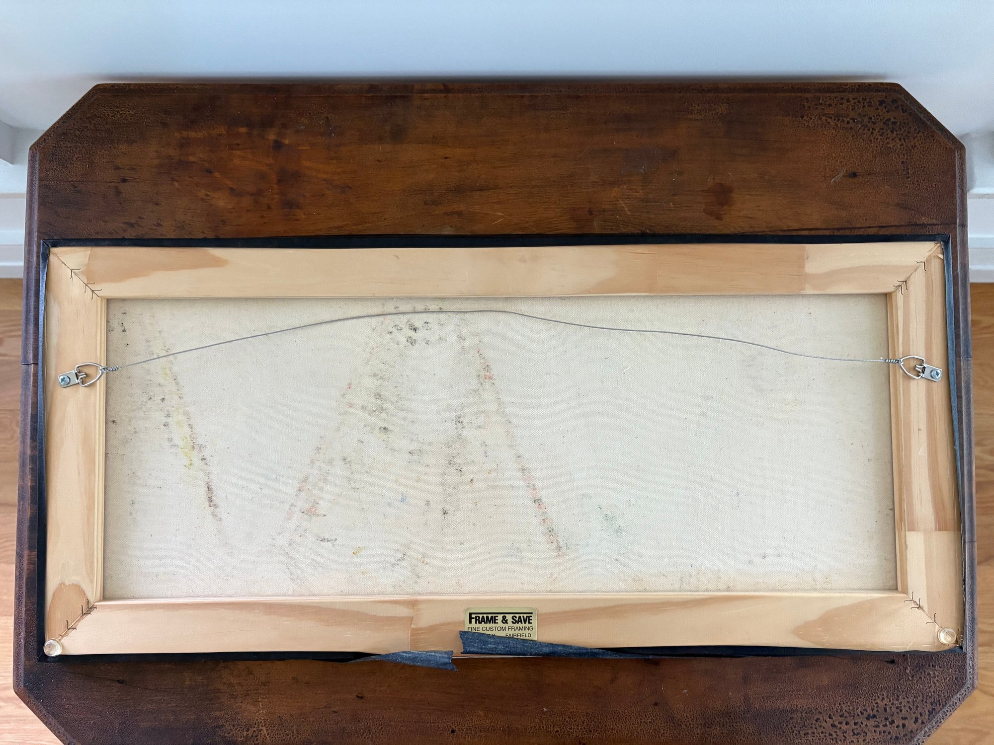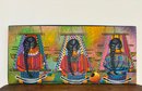 This framed painting depicts three Mayan women weavers from behind, showcasing their traditional attire and intricate hairstyles. The women are shown with long, braided hair and are dressed in vibrantly colored huipiles (blouses) with distinct embroidered designs, typical of different native Mayan villages in Guatemala.