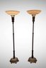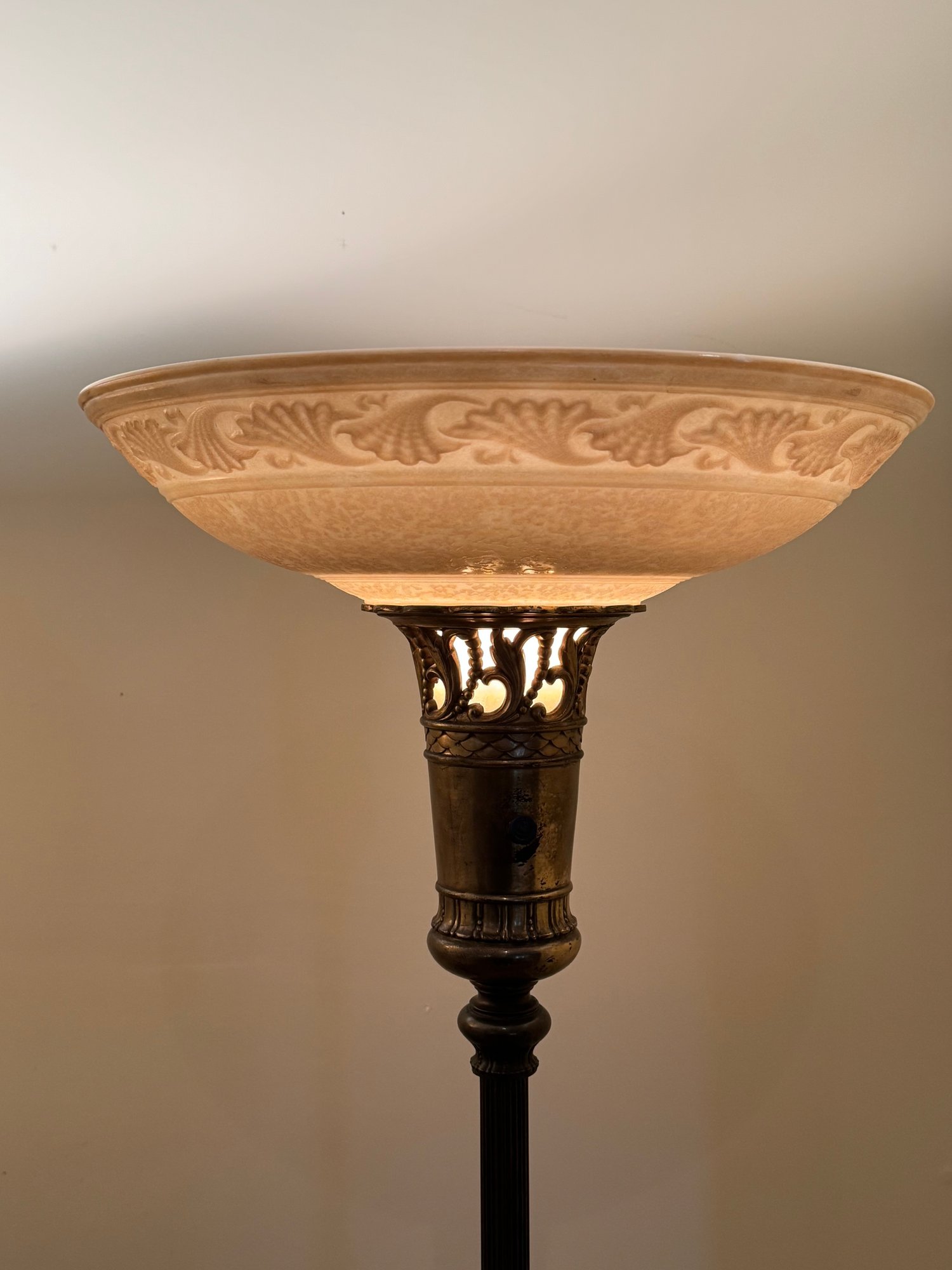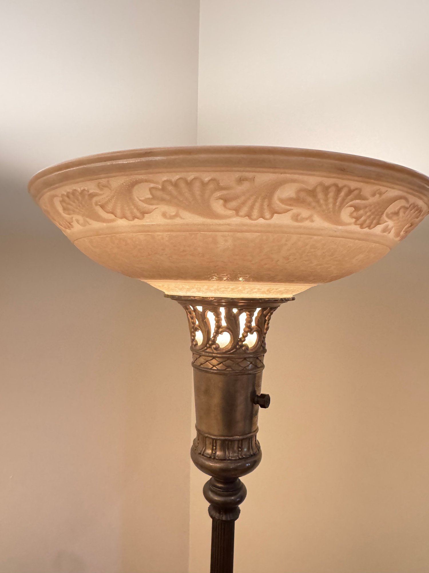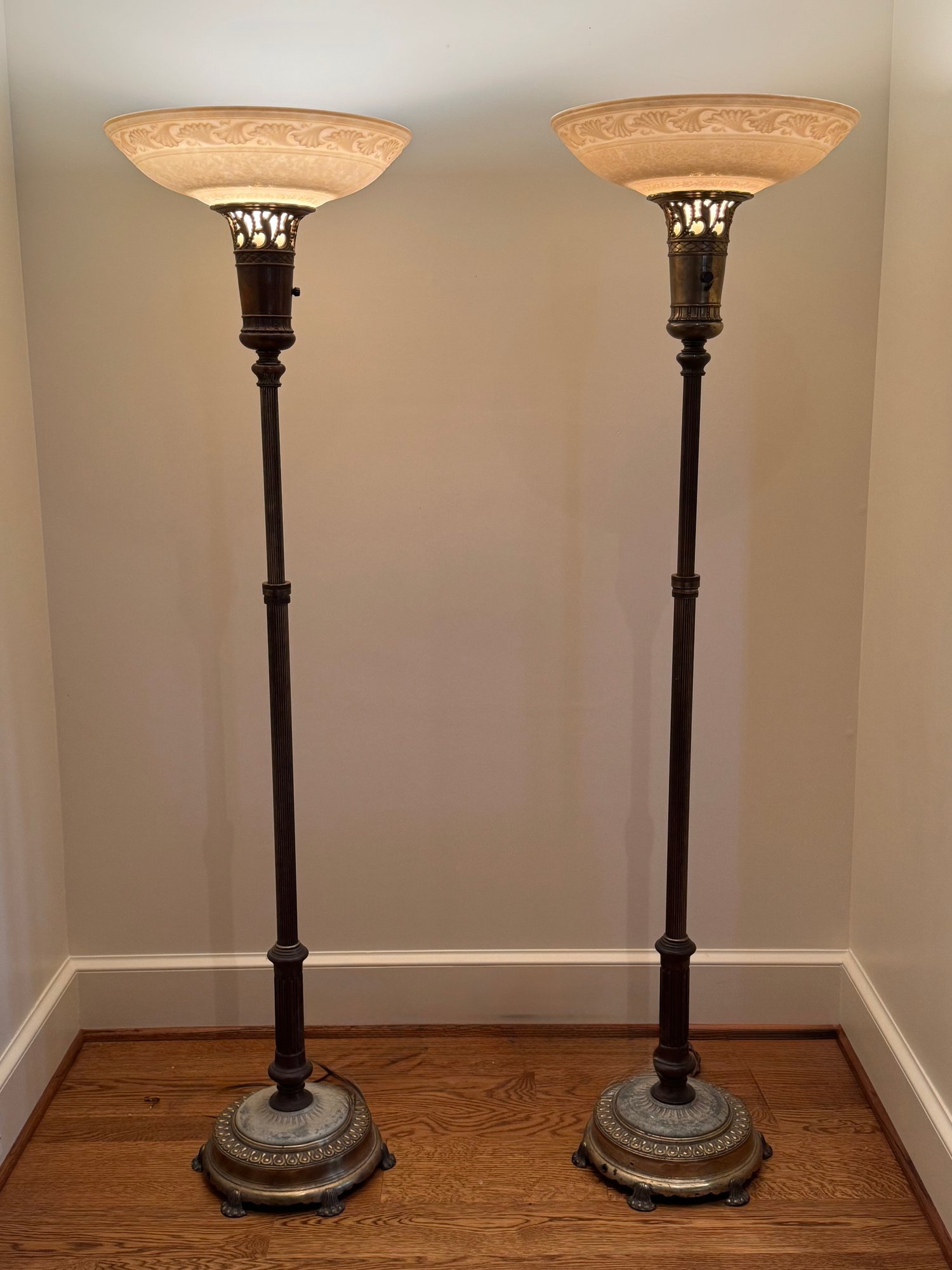 Gorgeous pair of deco torchiere lamps. The two tone glass shades have a raised botanical pattern on an ornate base and stem. One lamp needs an electrical tweek and flickers when turned on. The other works perfectly. The outer tone of the shade creates a romantic ambient lovely light.