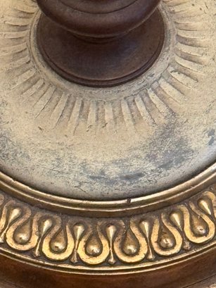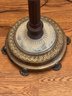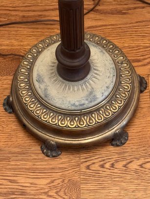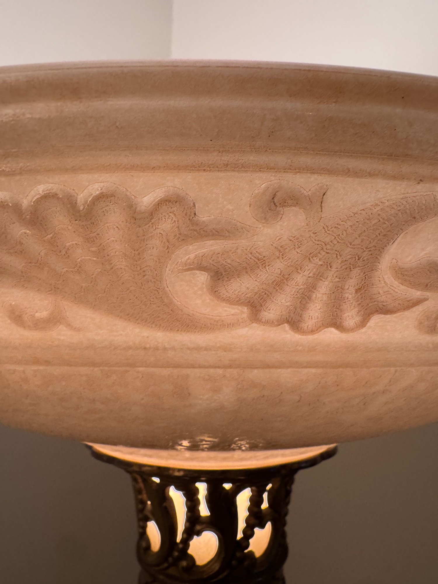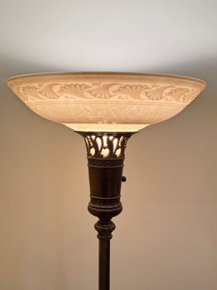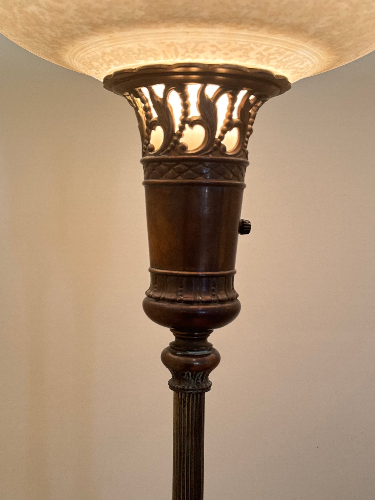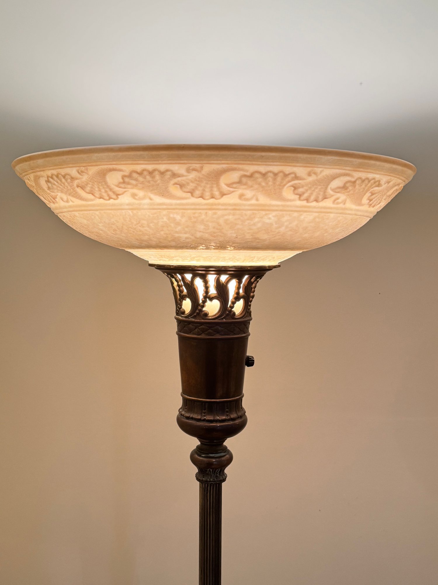 Gorgeous pair of deco torchiere lamps. The two tone glass shades have a raised botanical pattern on an ornate base and stem. One lamp needs an electrical tweek and flickers when turned on. The other works perfectly. The outer tone of the shade creates a romantic ambient lovely light.