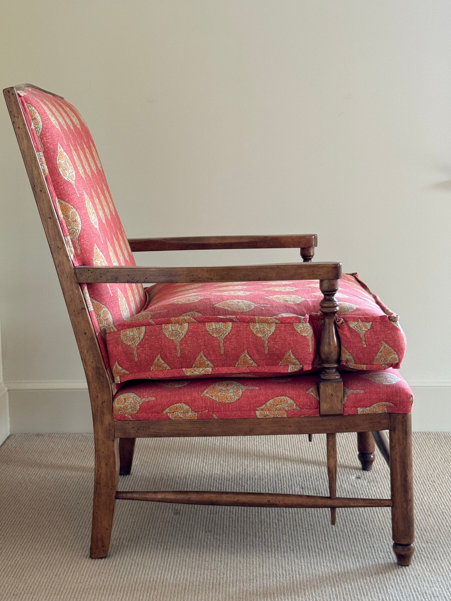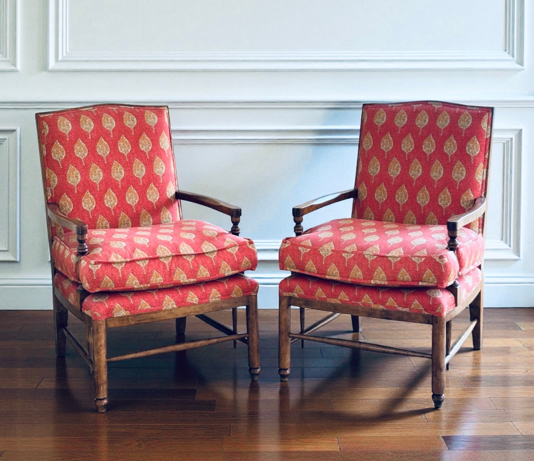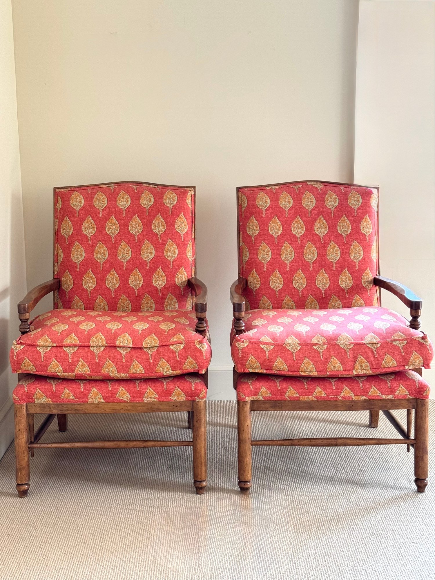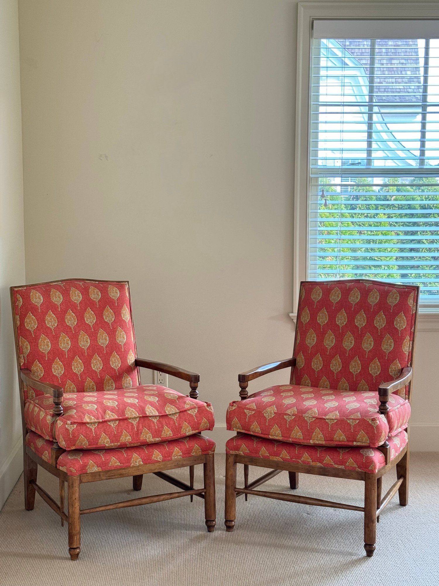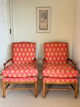 Beautuful pair of Minton-Spidell Normandie chairs in a lovely cotton botanical pattern. With down fill seat cushions In beautiful condition appear to be hardly used from this weekend home. Note: Chairs come with 2 matching small back seat pillows.