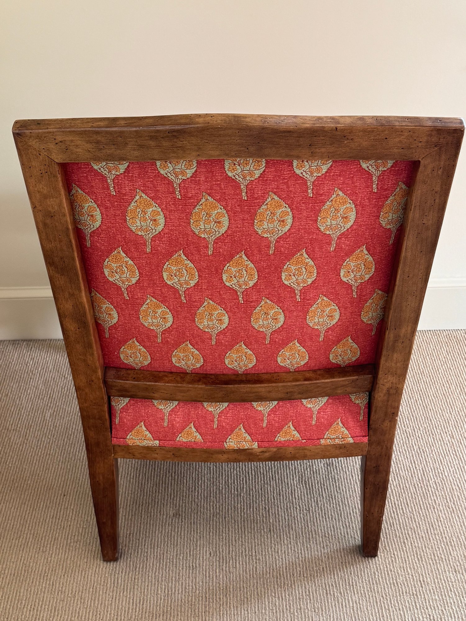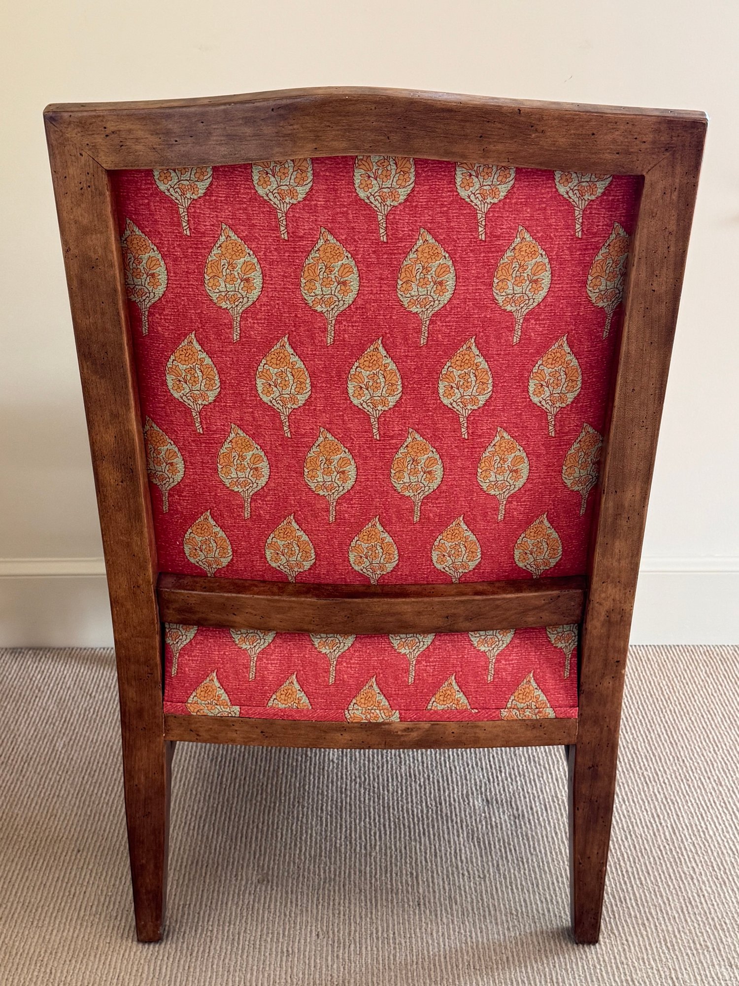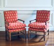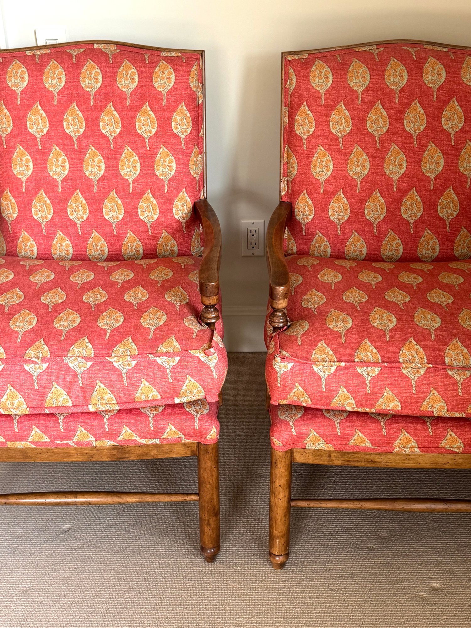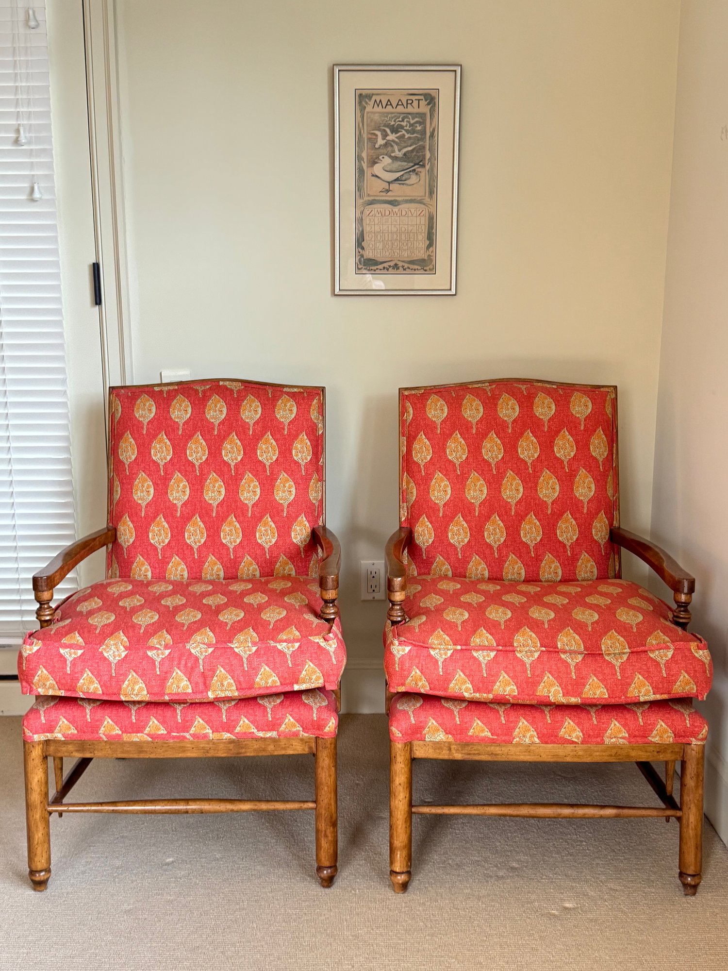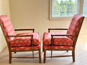 Beautuful pair of Minton-Spidell Normandie chairs in a lovely cotton botanical pattern. With down fill seat cushions In beautiful condition appear to be hardly used from this weekend home. Note: Chairs come with 2 matching small back seat pillows.