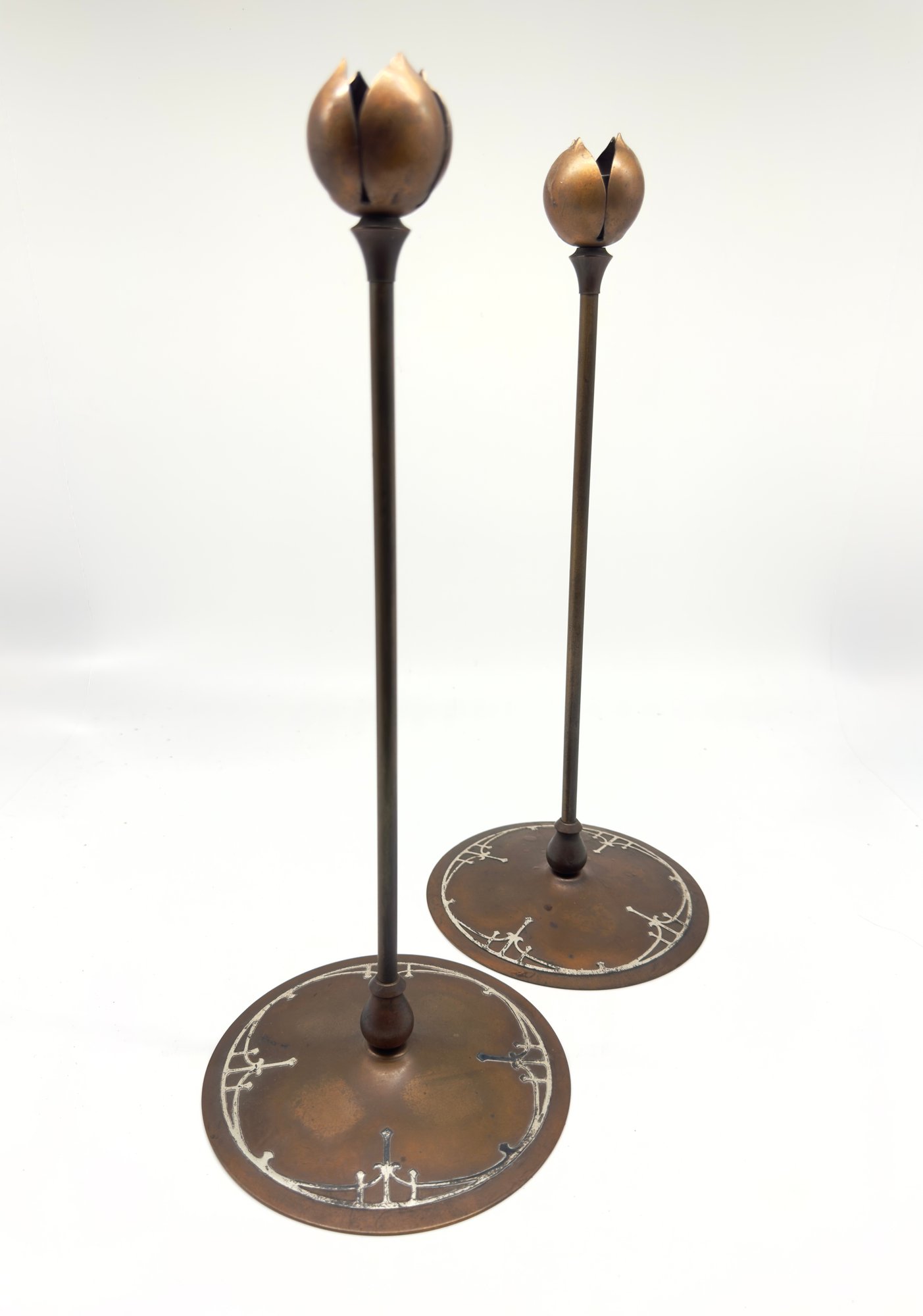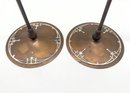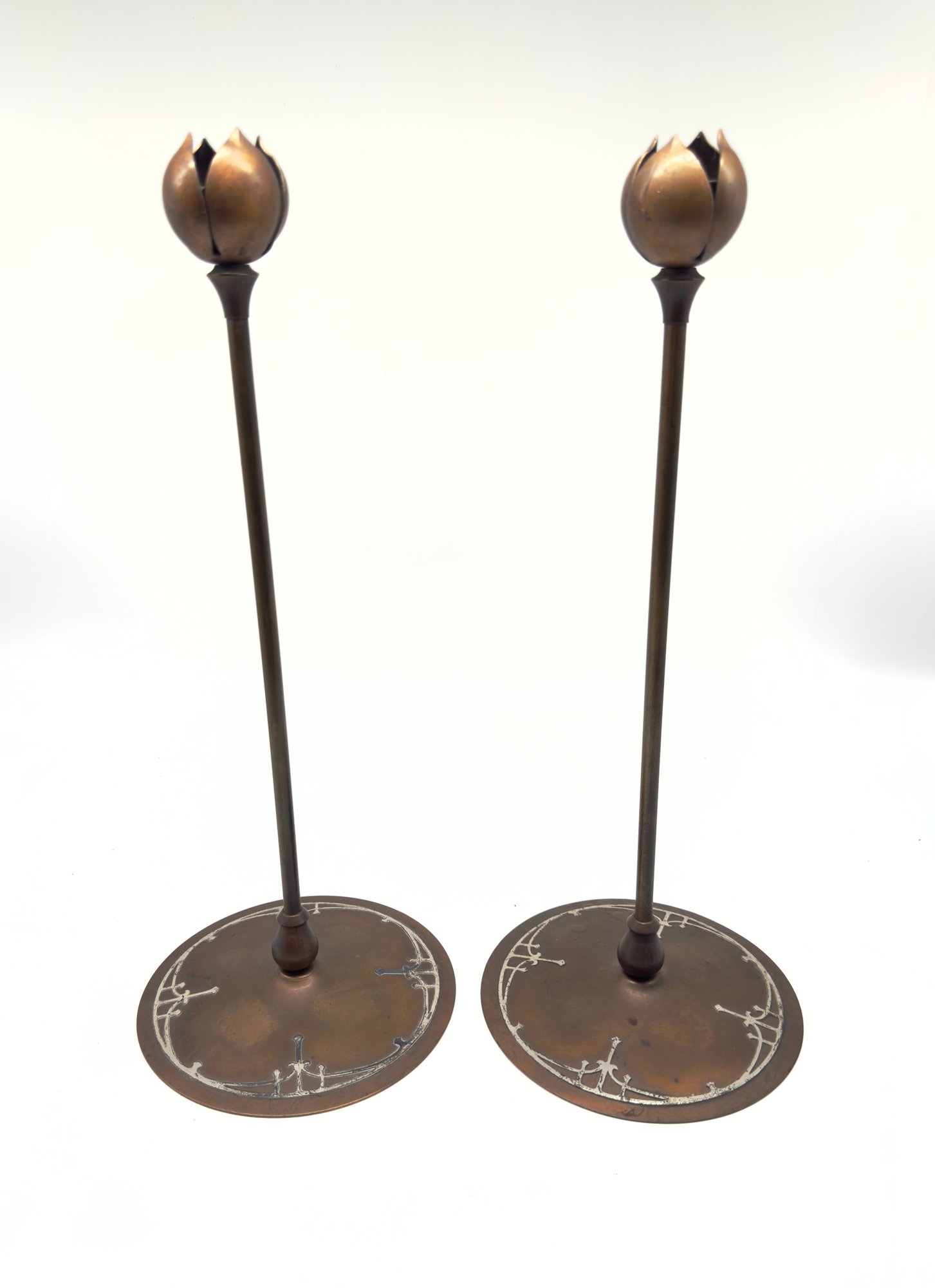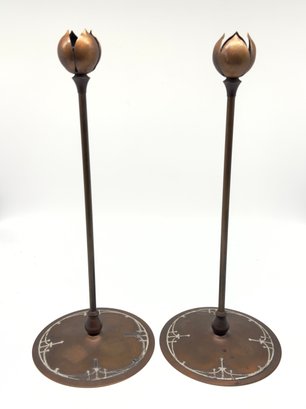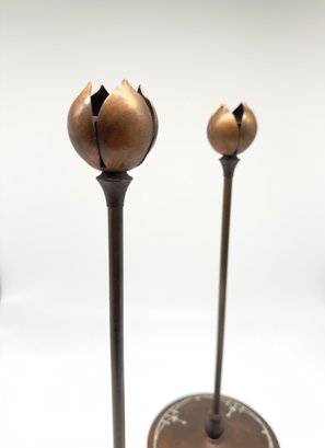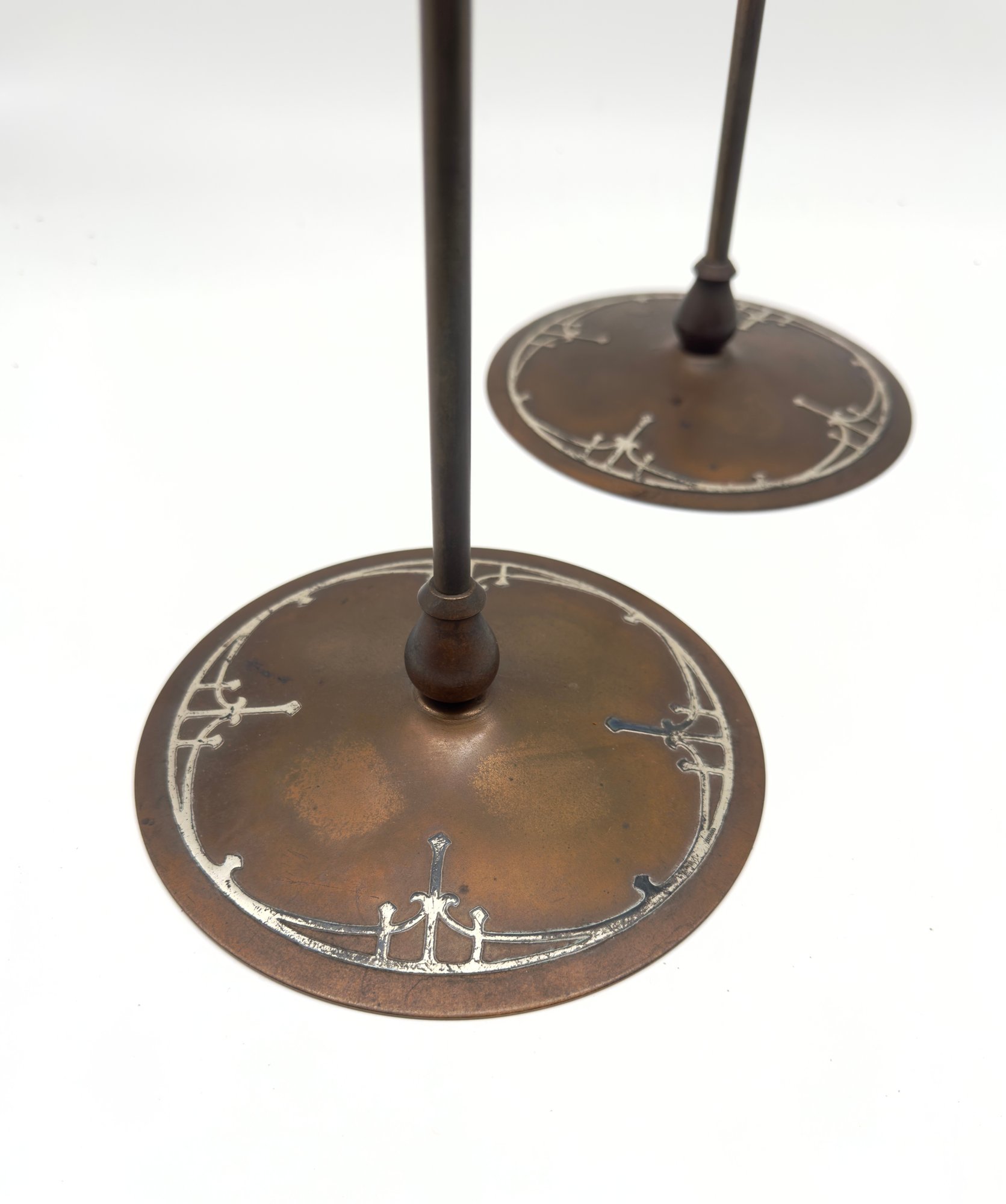 These style types of candle holders were produced by companies like Heintz Art Metal Shop and Tiffany Studios during the early 20th century. One candlestick is marked
