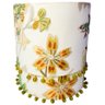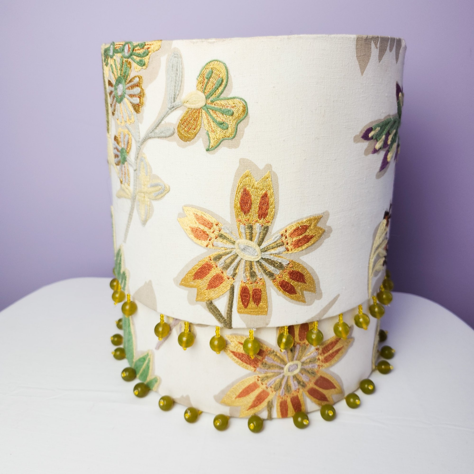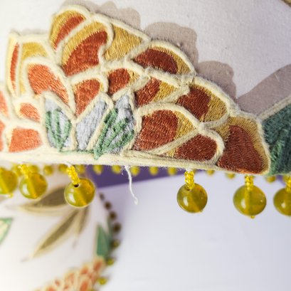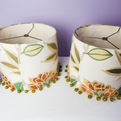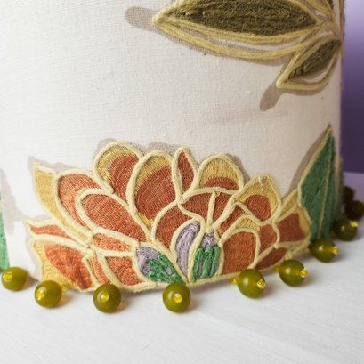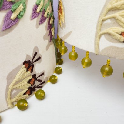 Pretty and high quality floral embroidered drum lampshades with beads hanging around bottom of each.