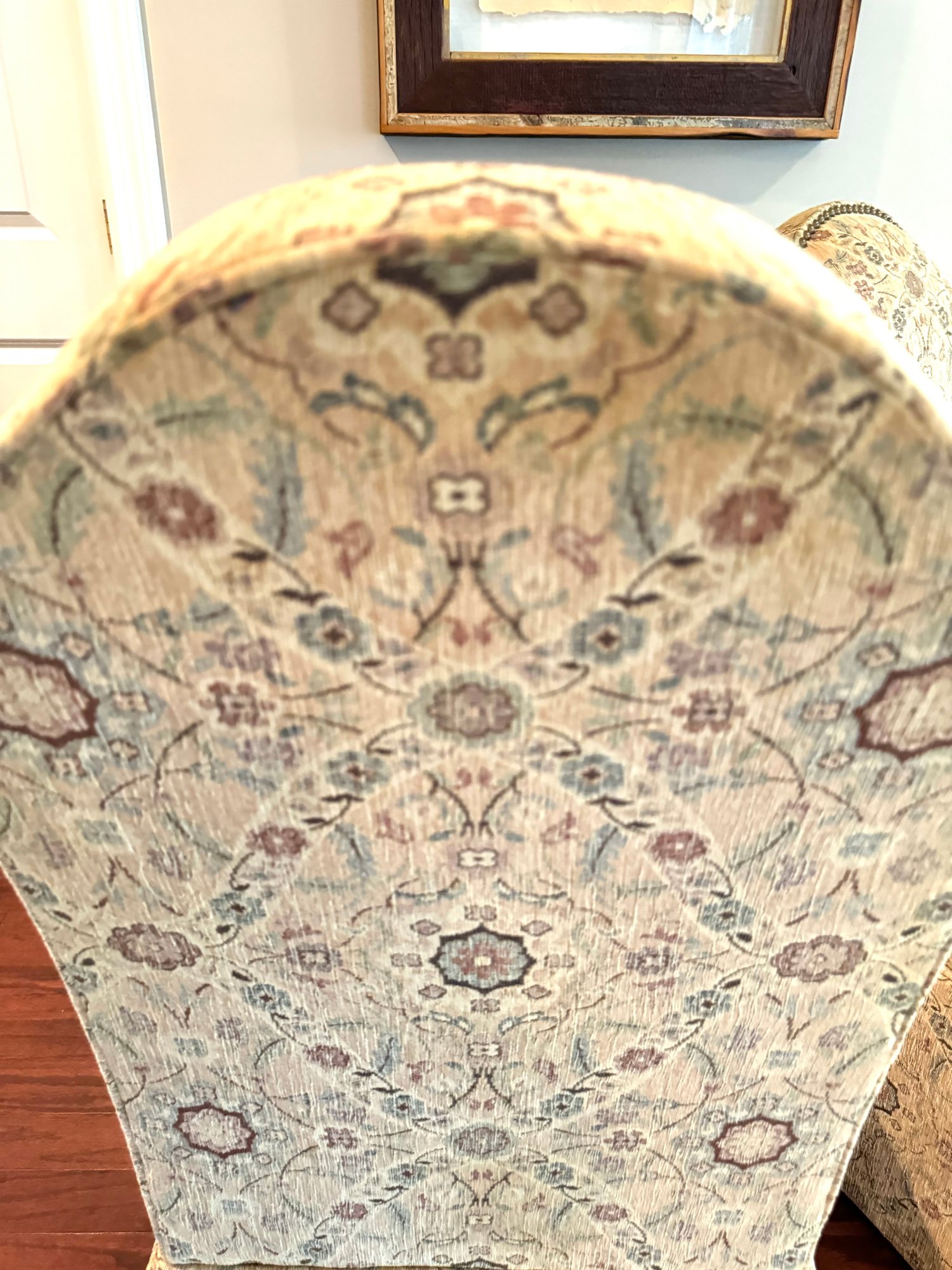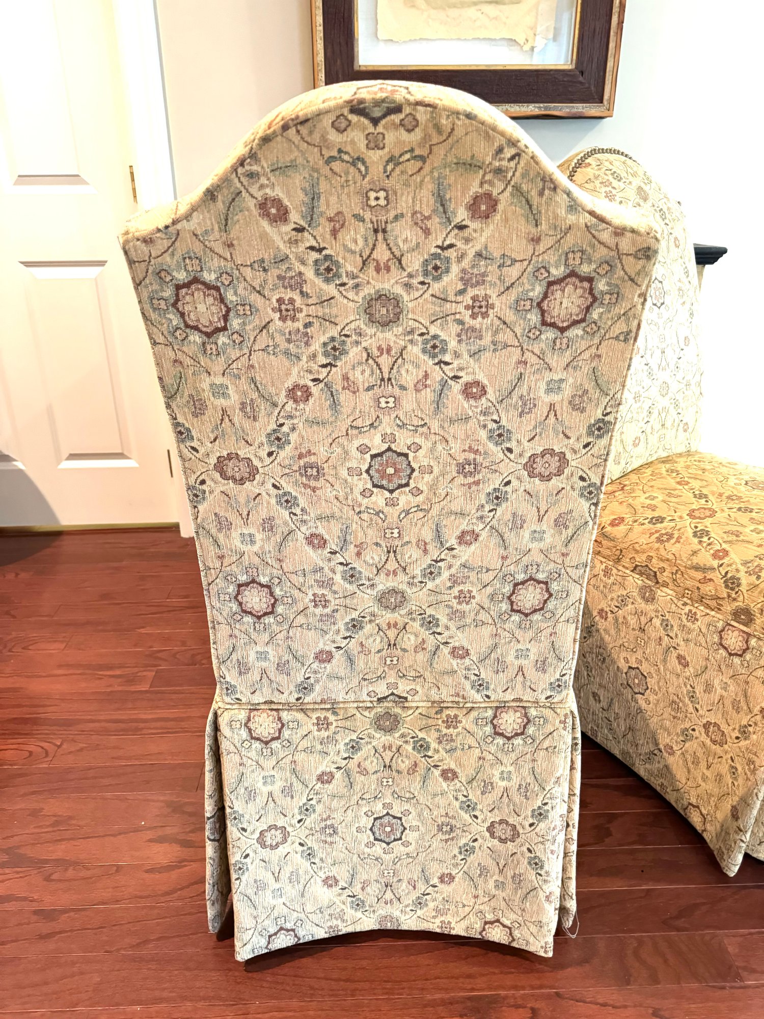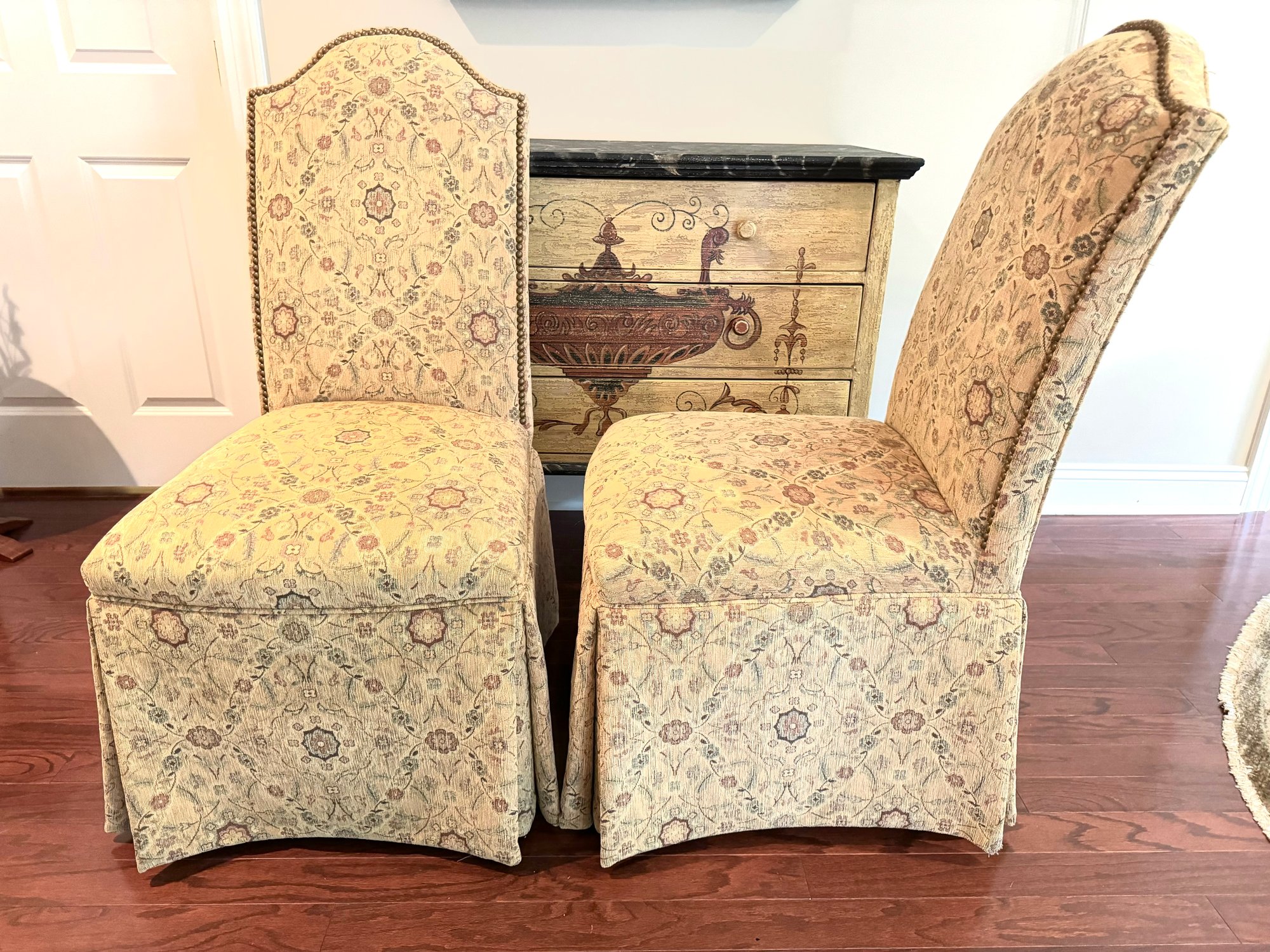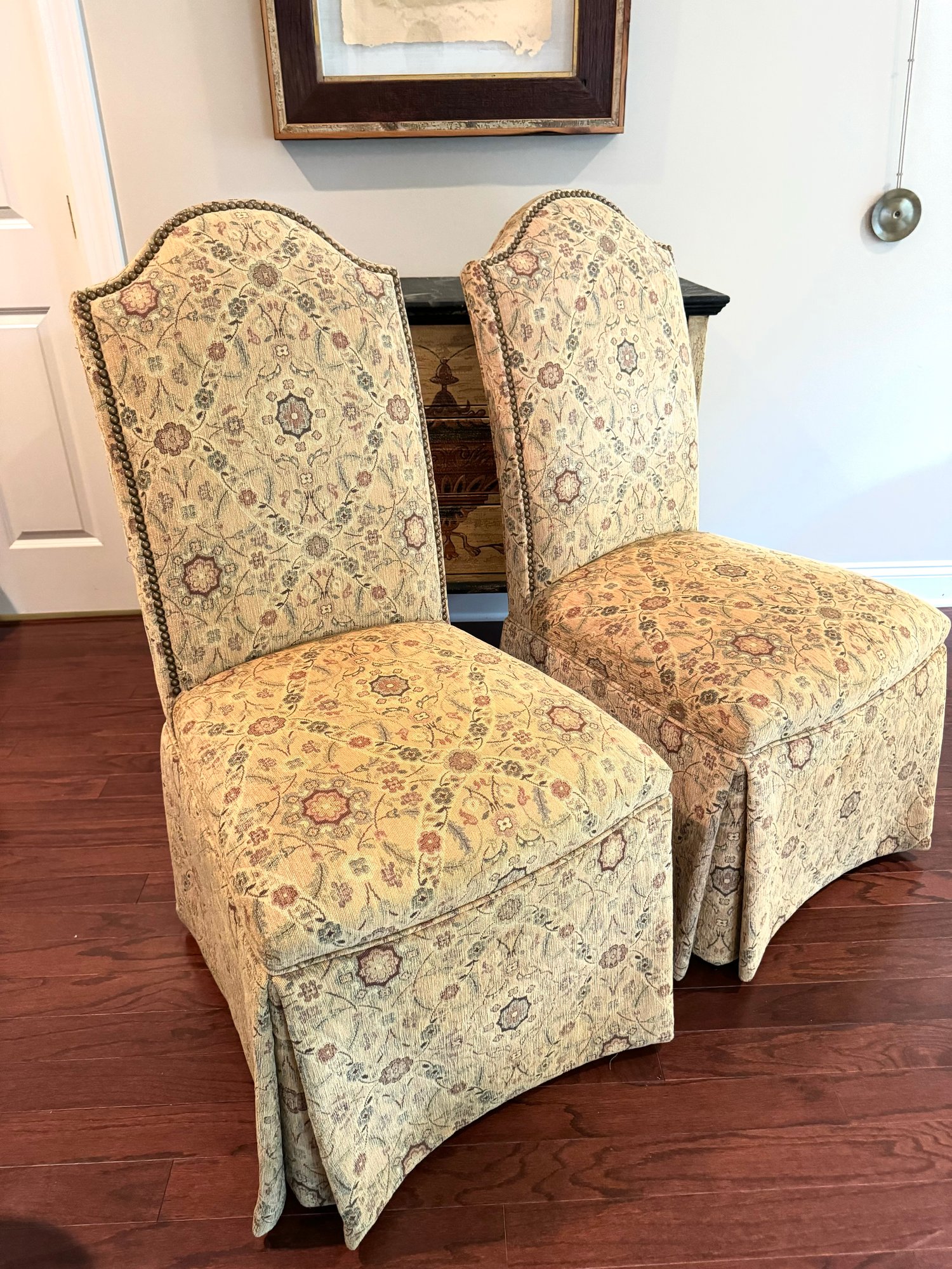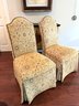 Charming pair of slipper chairs in a tapestry style fabric with hobnail detail. Perfect for dining tables or as side chairs.