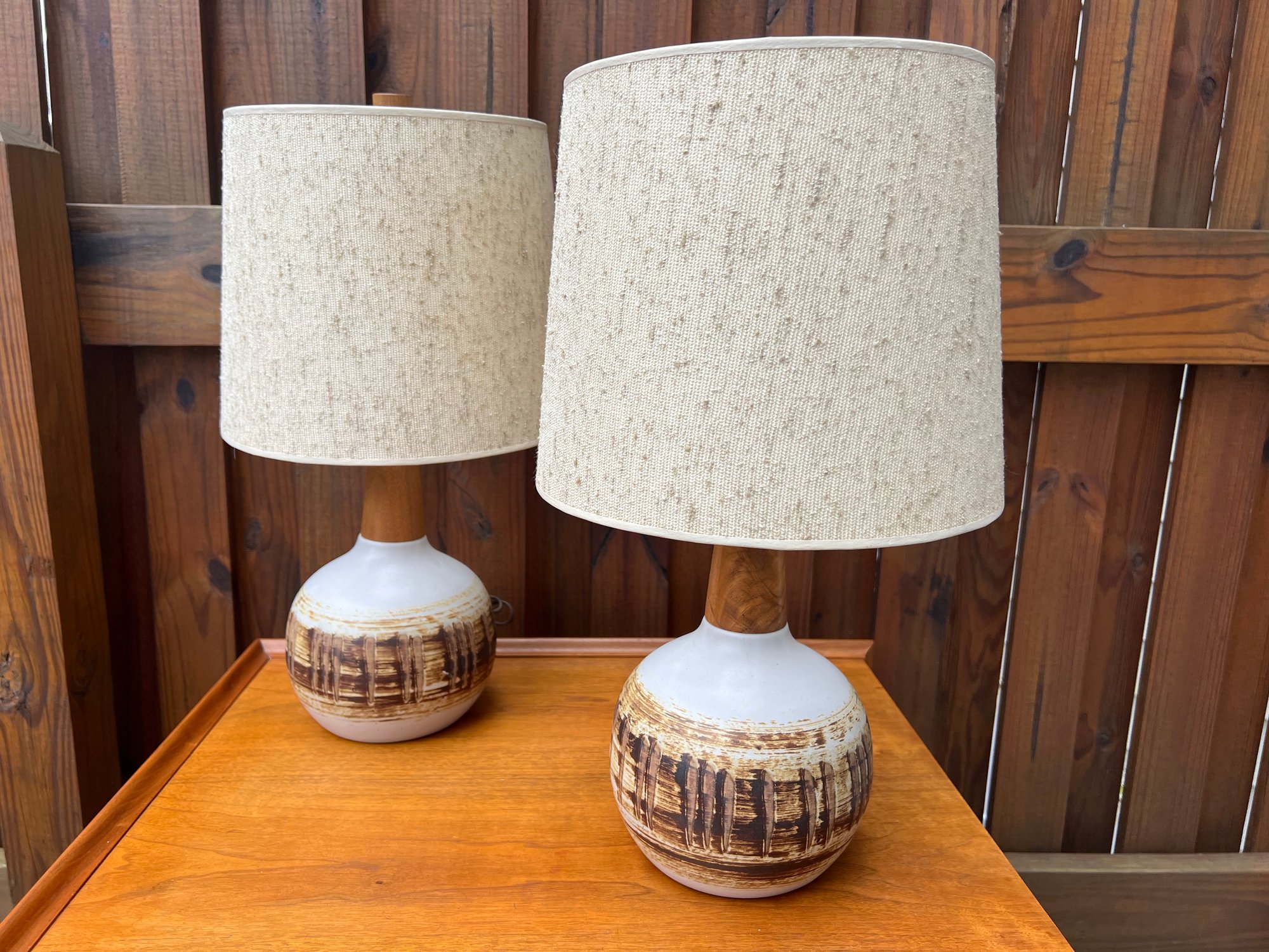pair of 1970s Jane and Gordon Martz Table Lamp in Ceramic and Walnut. Beautiful, working, and a PAIR. Both have the Martz signature. Original lamp shades.