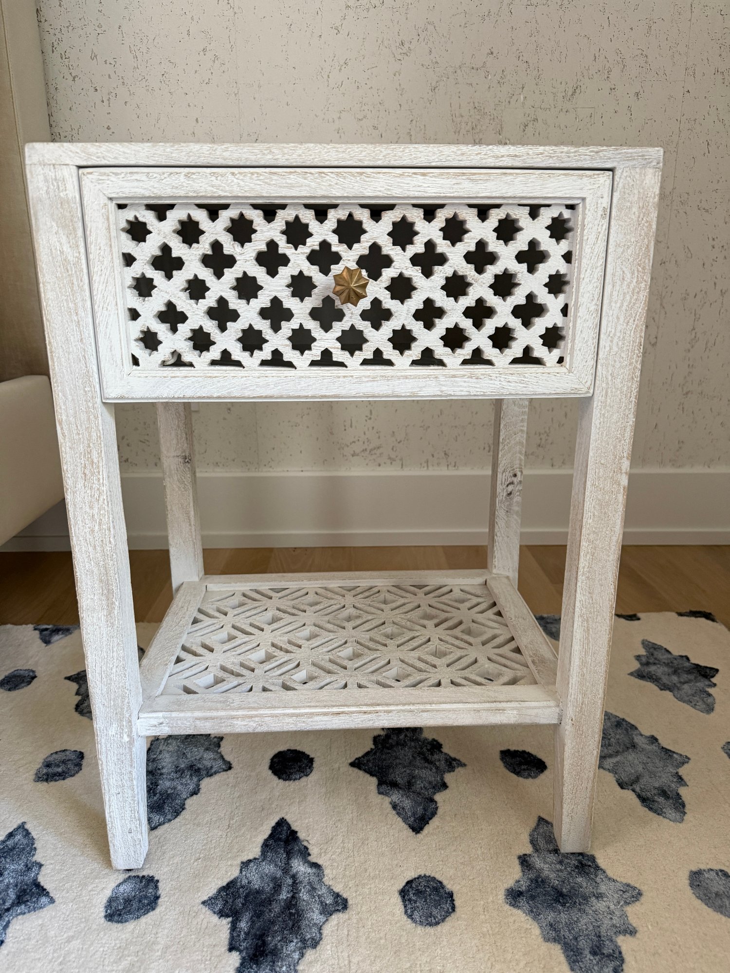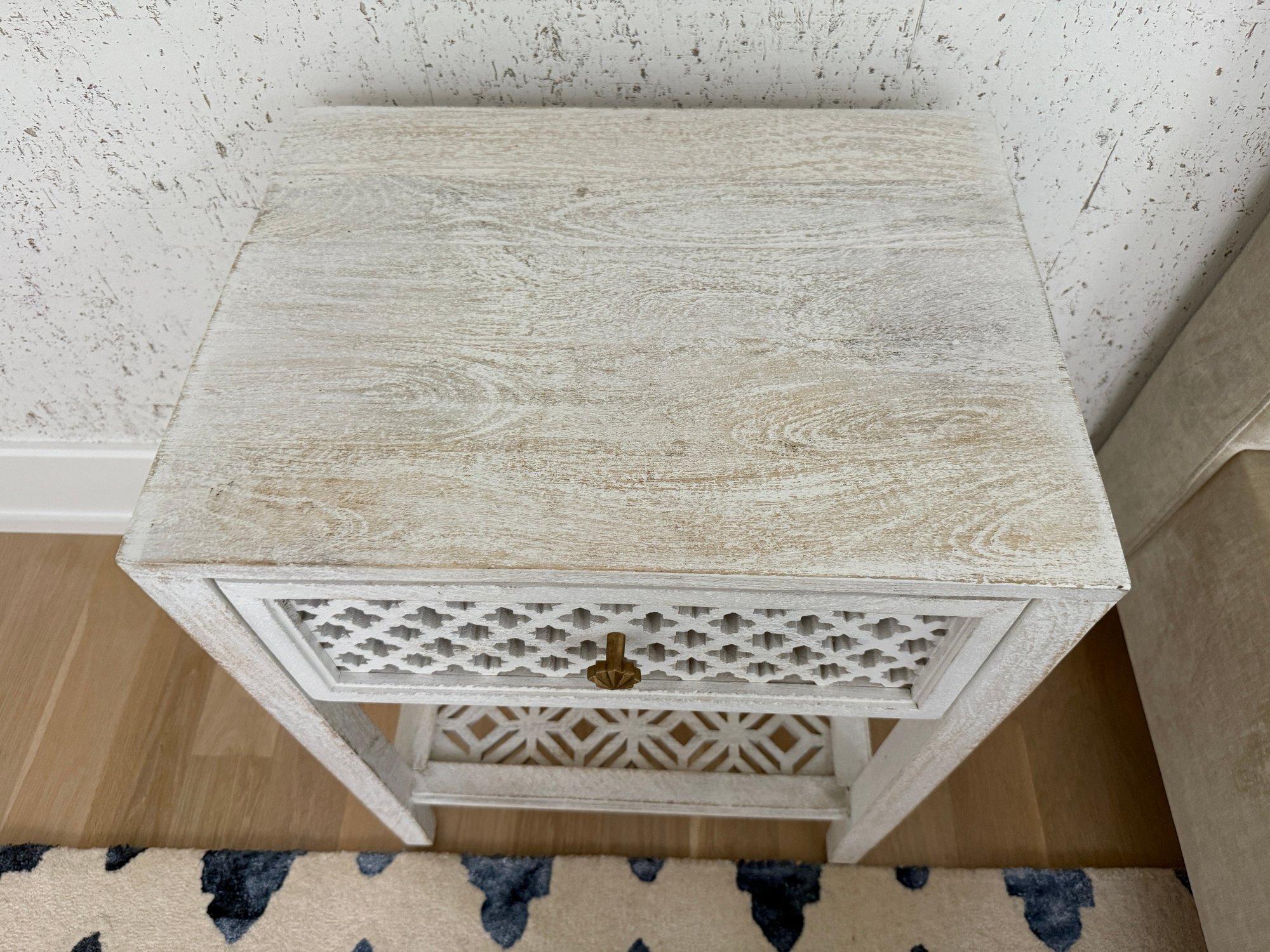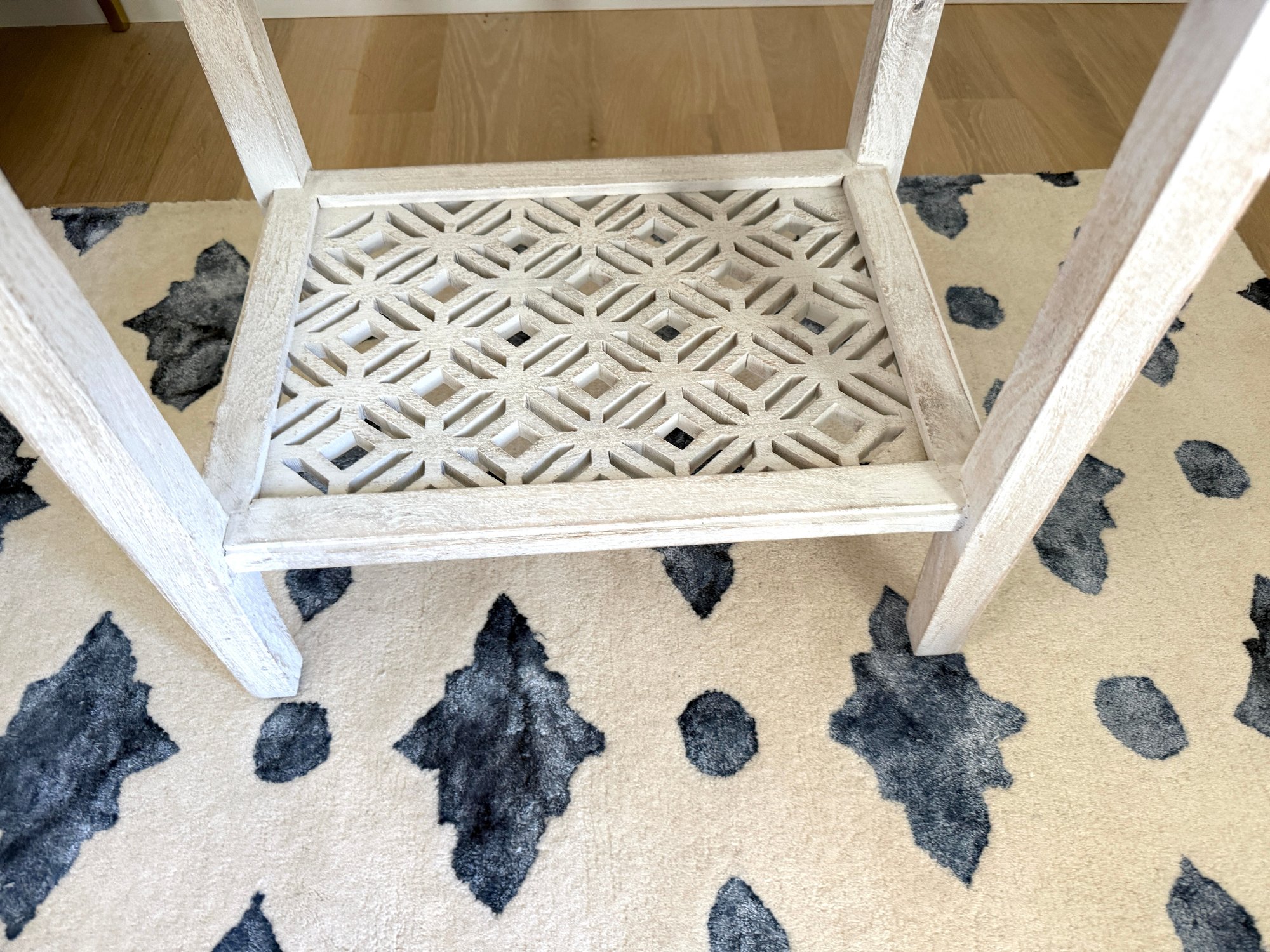 Hand carved and whitewashed.