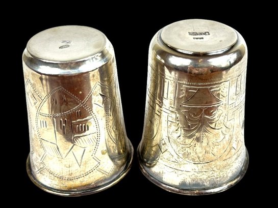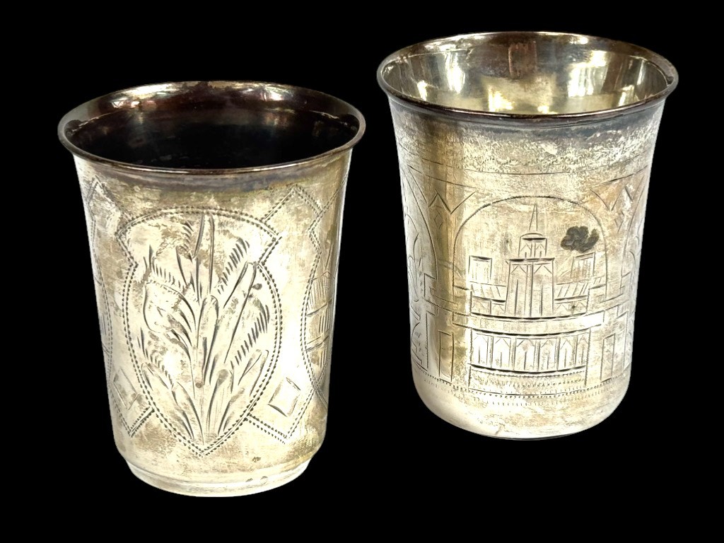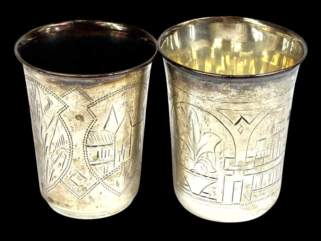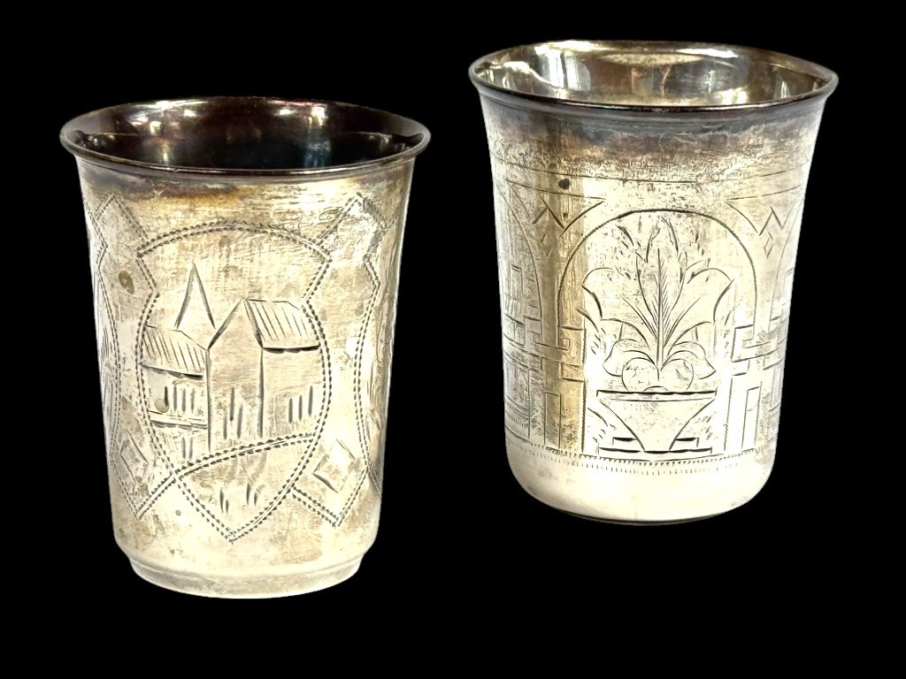 A beautiful pair of antique continental silver beakers (commonly referred to as Kiddush cups), each marked “84”.