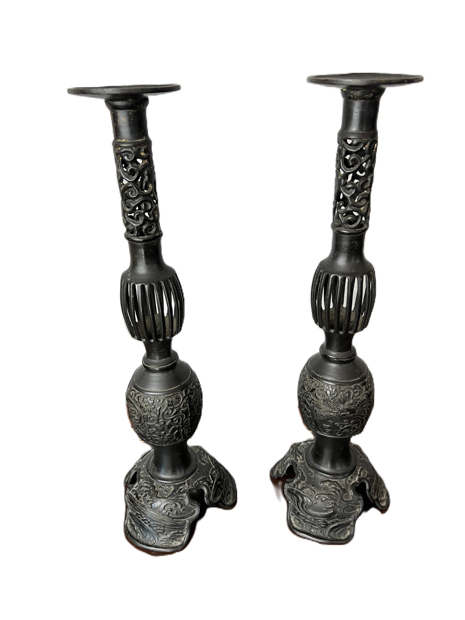 Pair of vintage or antique cast iron Chinese candlesticks featuring a pheonix bird design.
