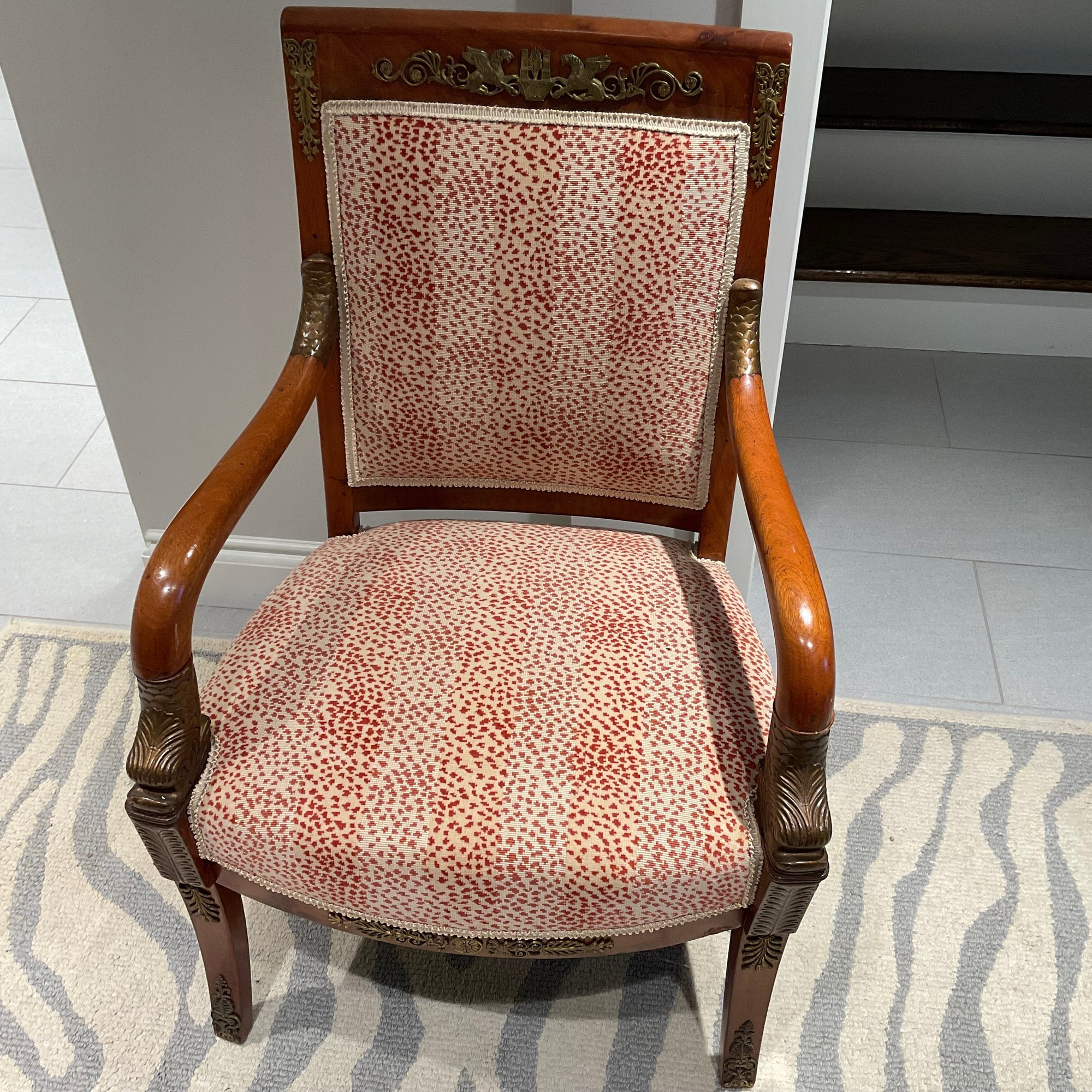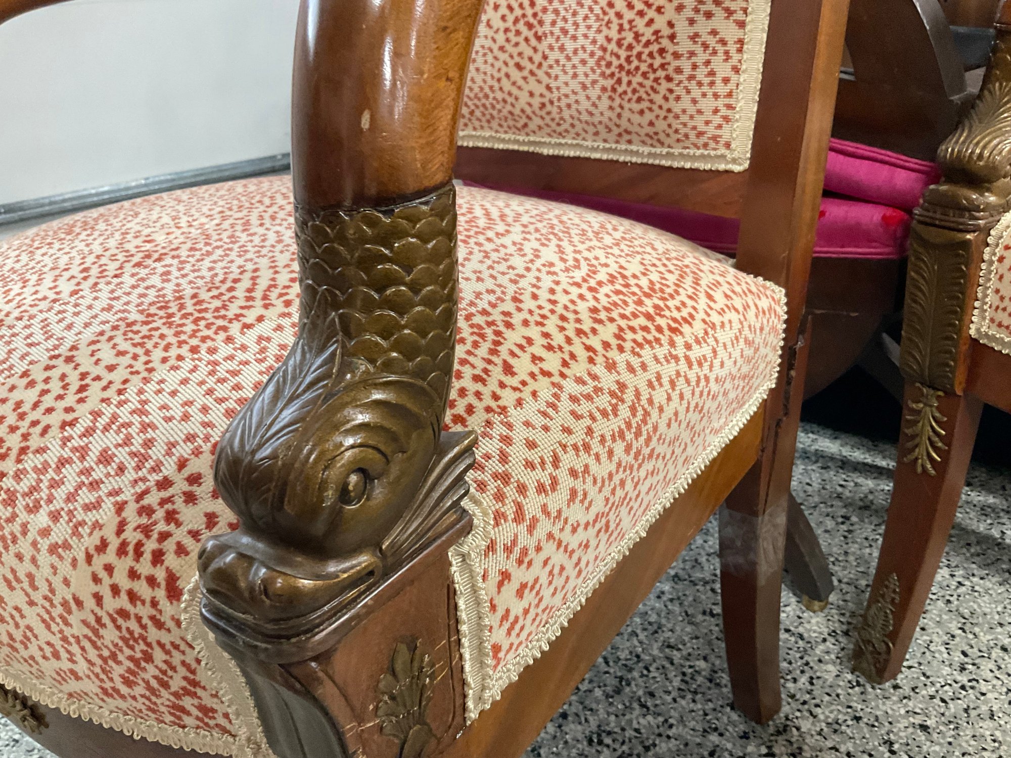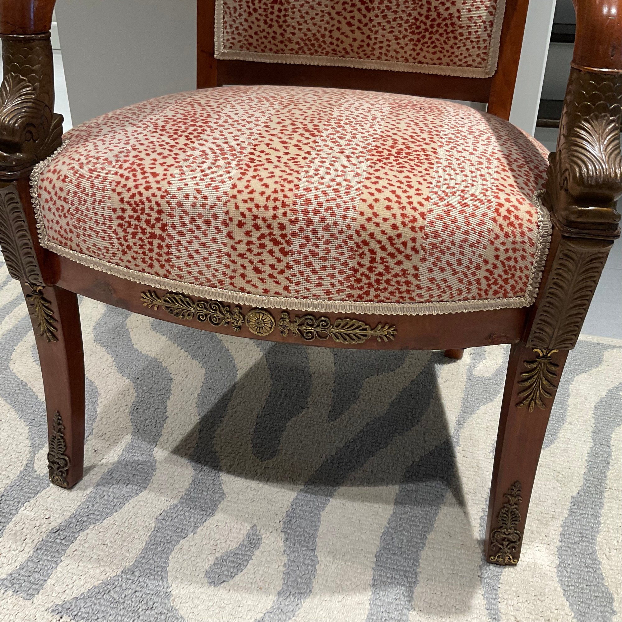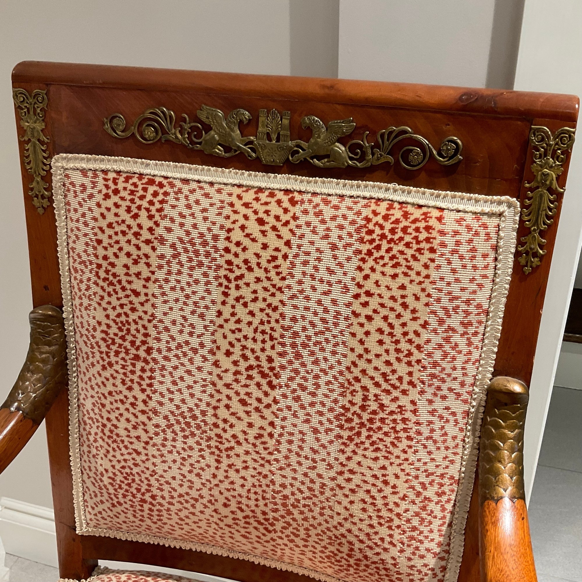 Pair of gorgeous French Empire armchairs. Carved fish and scales on arms painted in gold. Brass detail across back Animal print fabric.