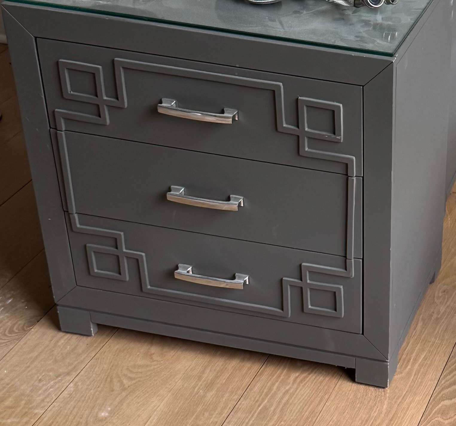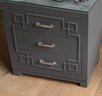 Charcoal Grey with custom glass top made to fit. Good condition.