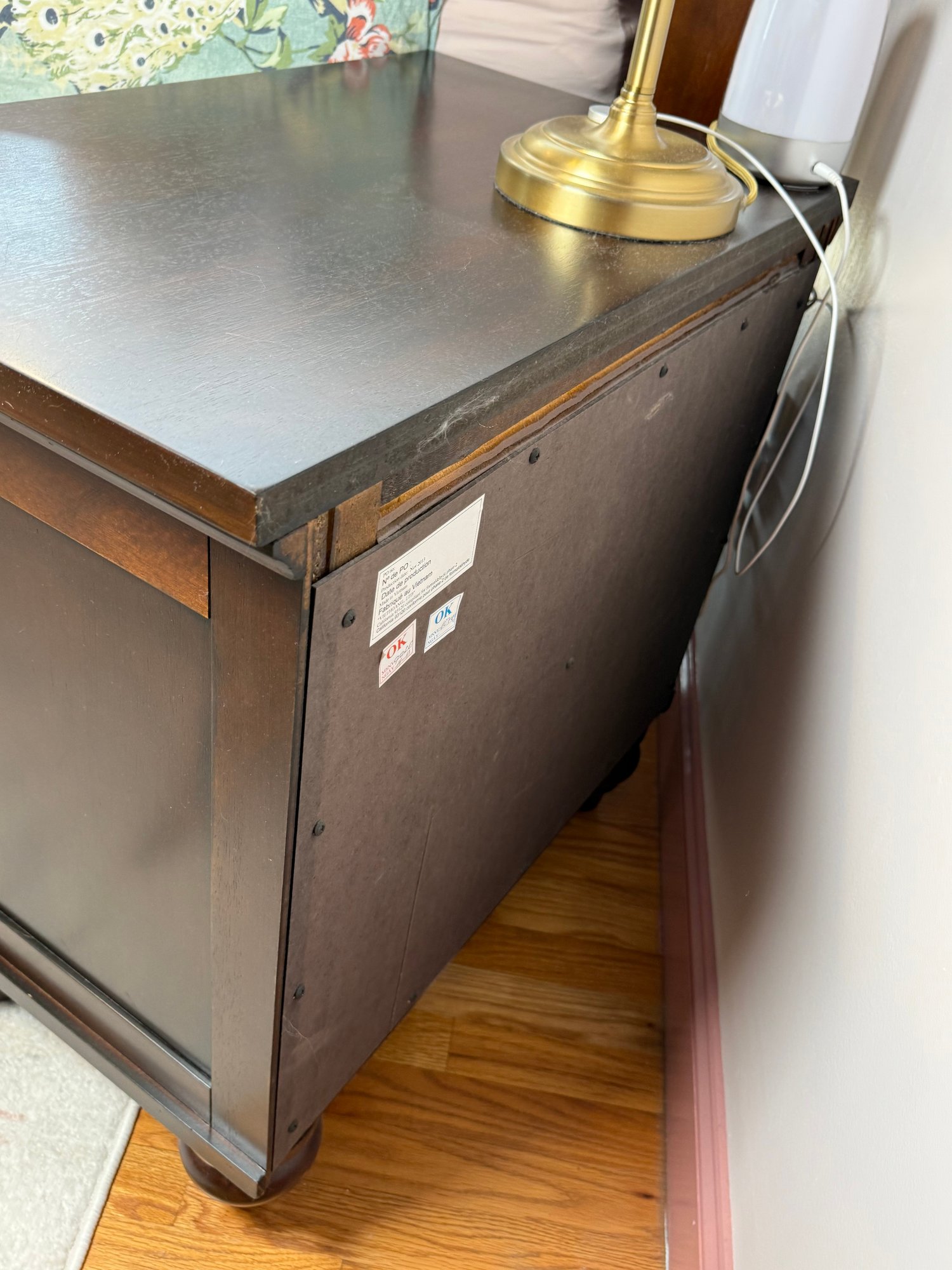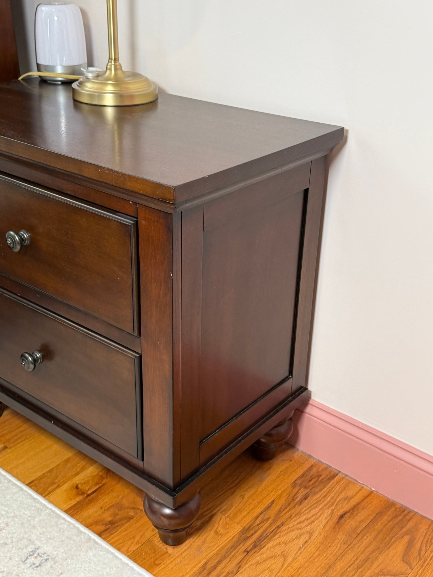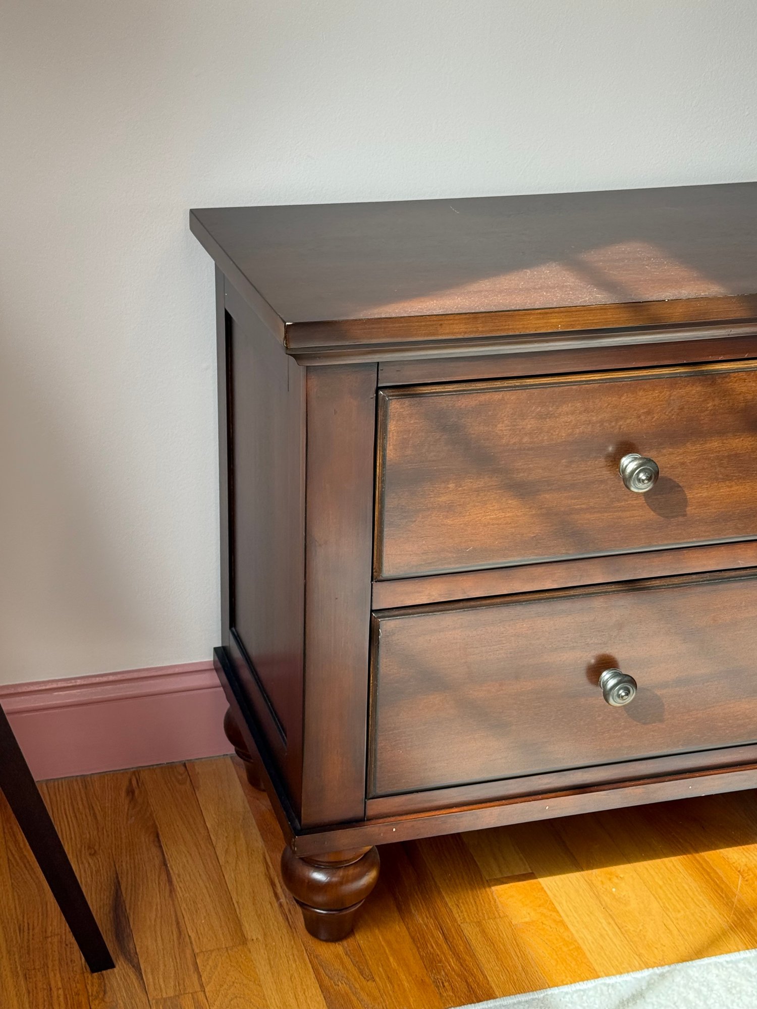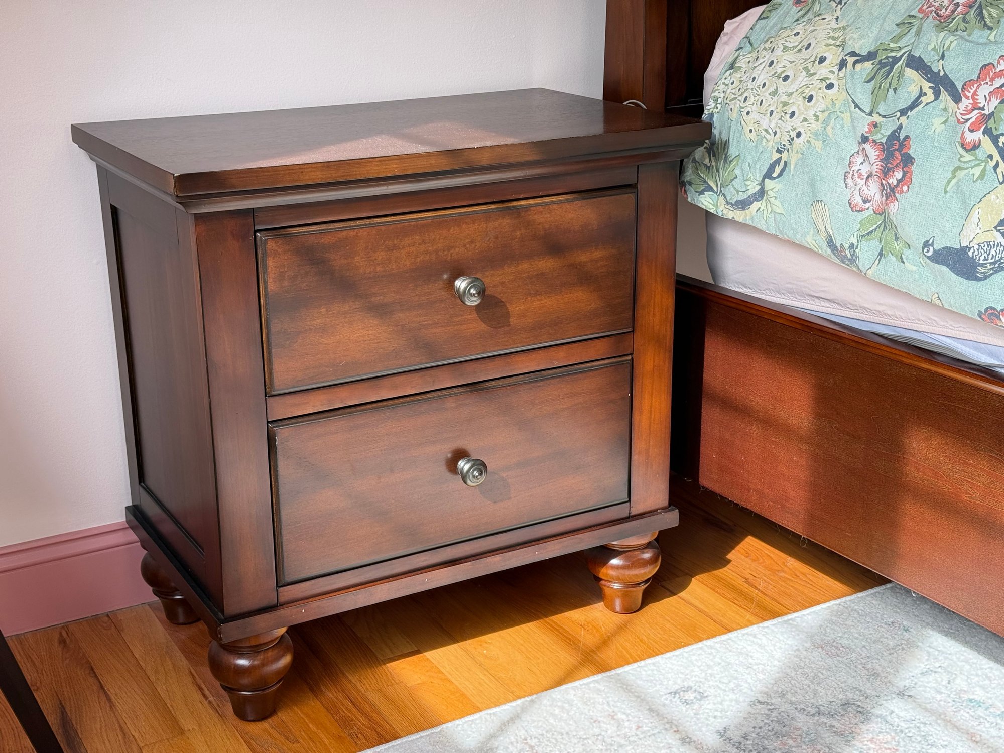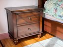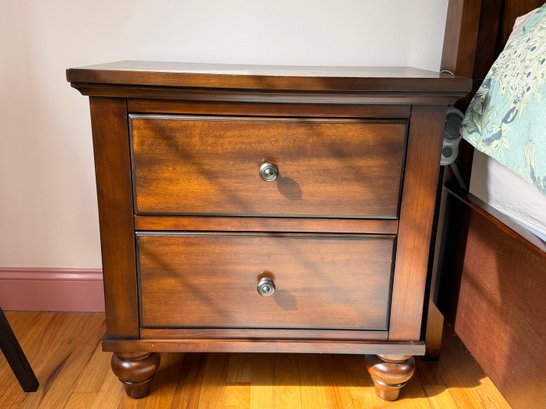 Classic pair of two drawer night stands featuring a warm, rich cherry finish and traditional styling. The nightstands offer a practical storage layout with two drawers each, fitted with round metal pulls. Gently molded edges, paneled drawer fronts, and turned bun-style feet give the piece a timeless bedroom furniture look.