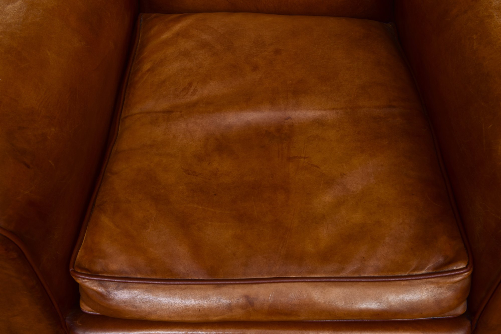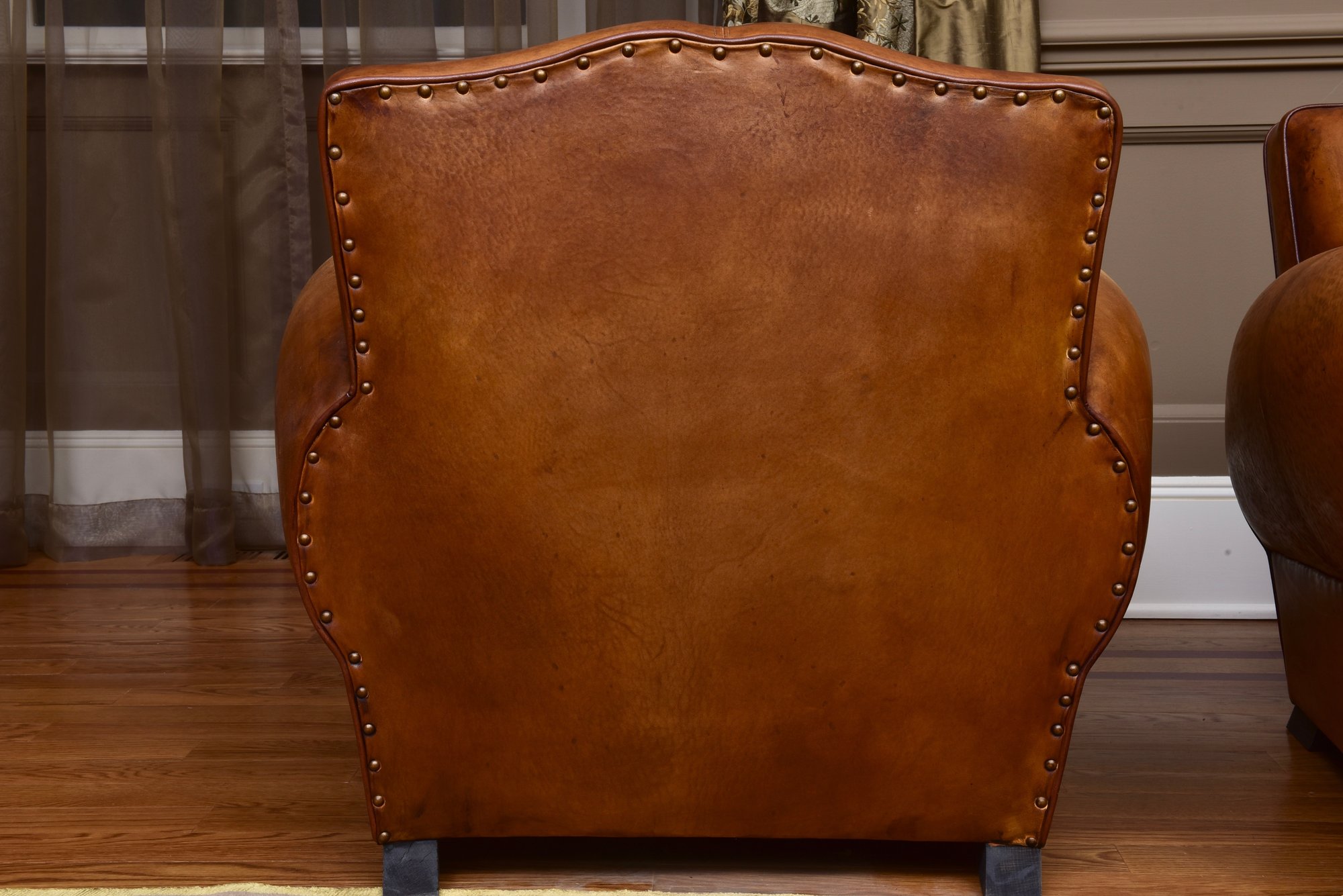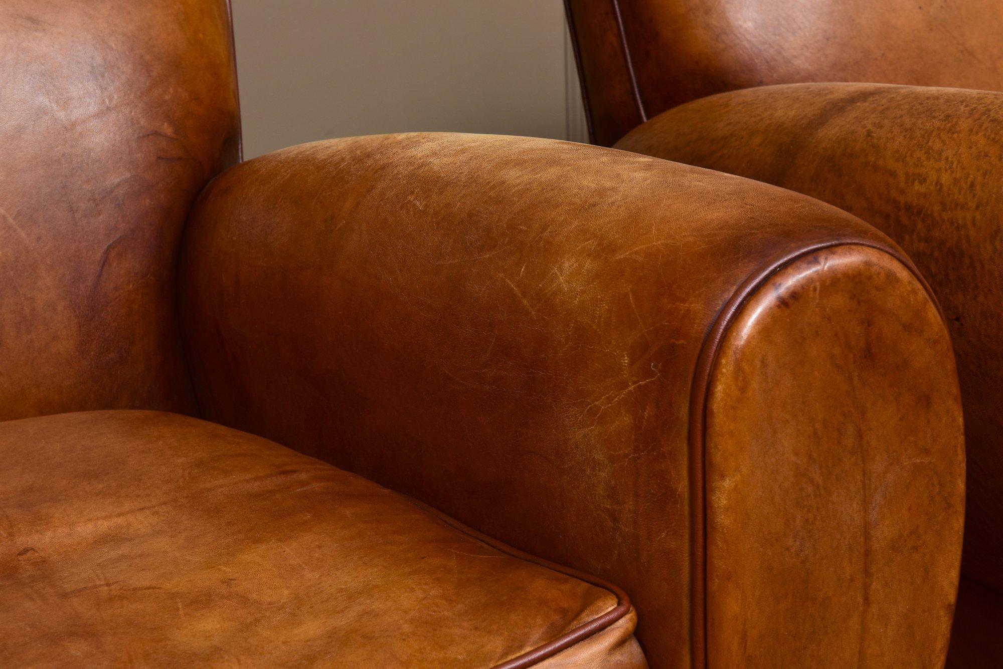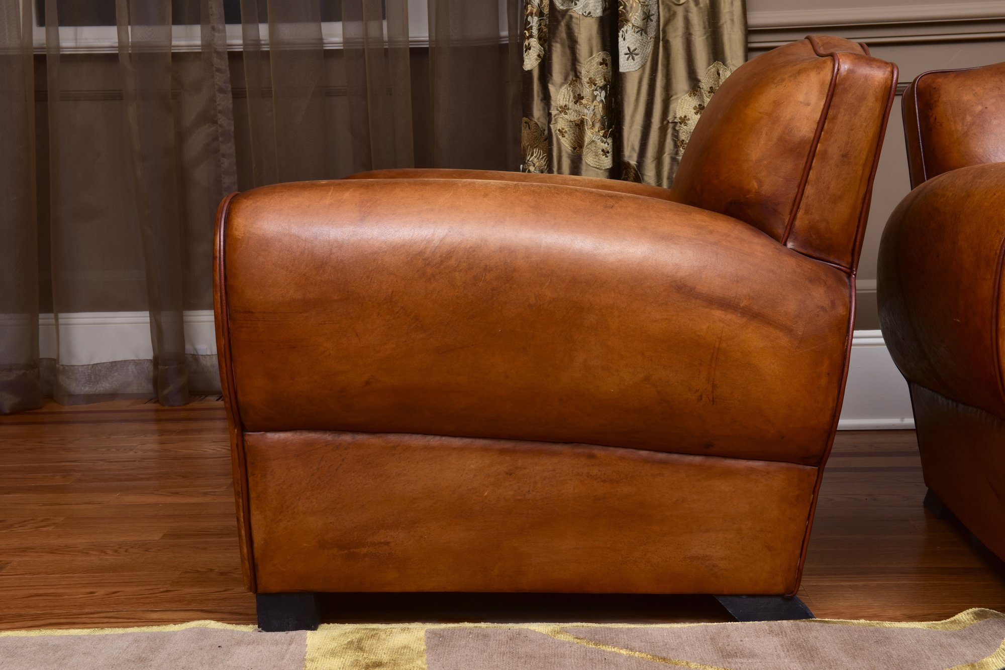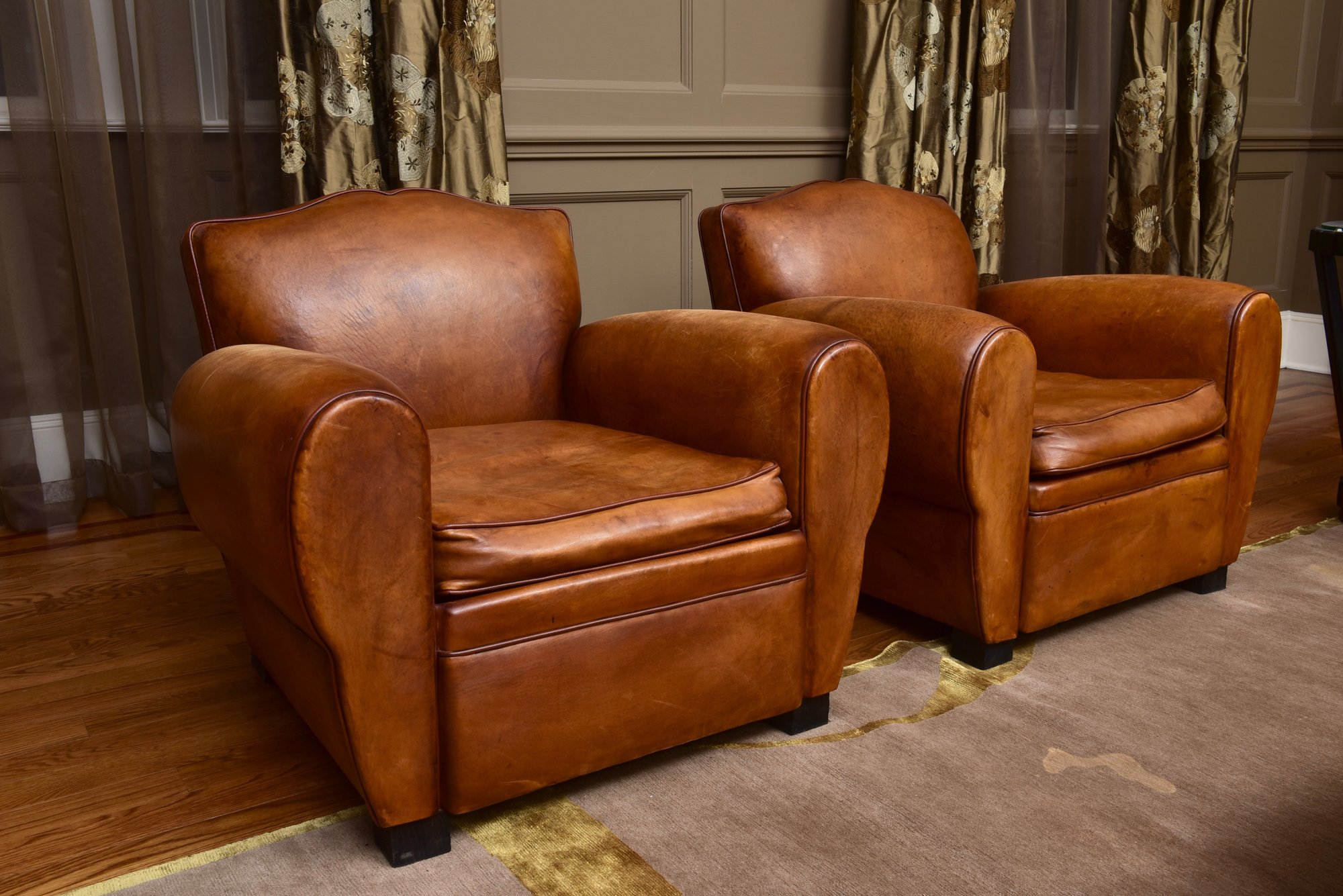 Elegant pair of leather club chairs, upholstered in a rich cognac-toned leather with a softly rounded barrel back and generously padded seat cushions. The chairs feature broad, rolled arms and a low, grounded profile, offering both comfort and timeless appeal. Resting on sturdy block feet, they present a well-balanced silhouette suitable for a variety of interiors.