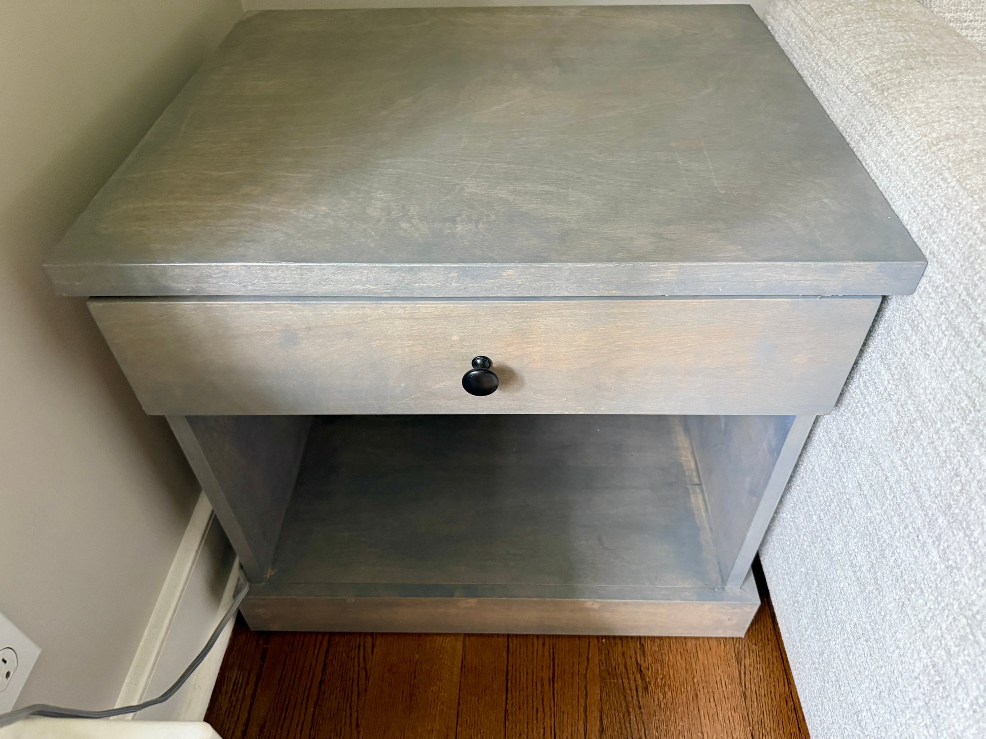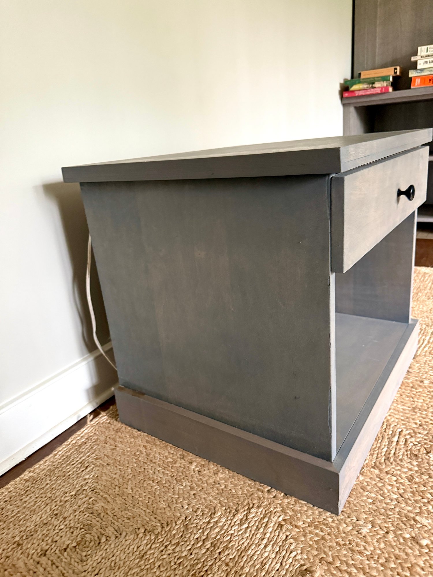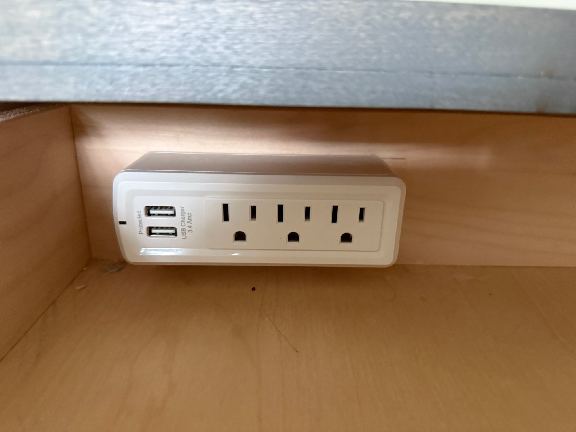 Power strip inside soft close drawer (hole in back for wires)