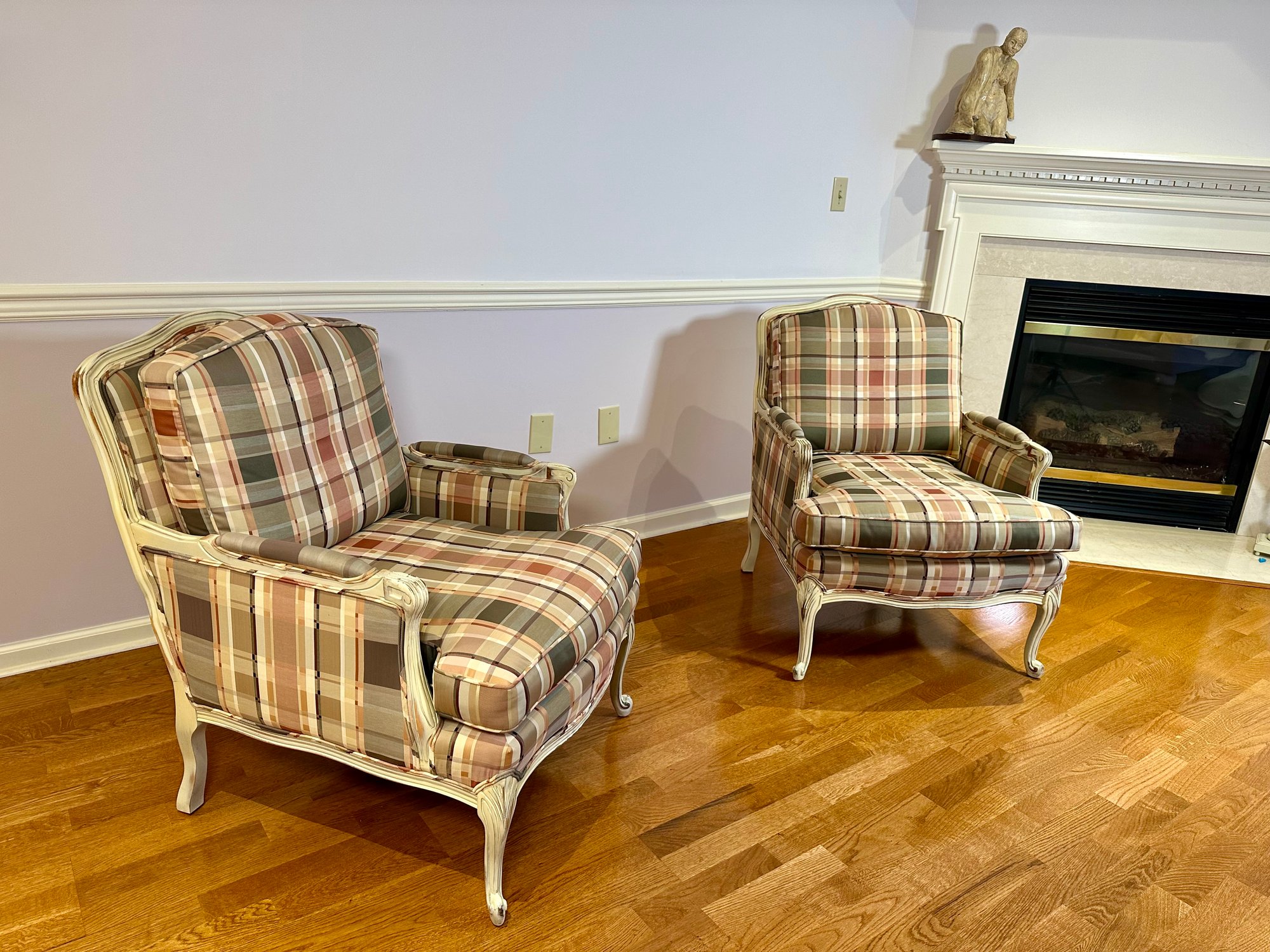 Pair Of Custom Upholstered Plaid Chairs With sturdy wooden frames that have a naturally distressed farmhouse look to them. They are in very good condition.