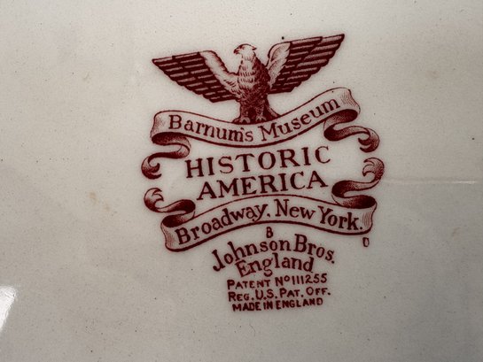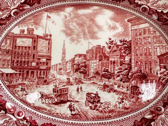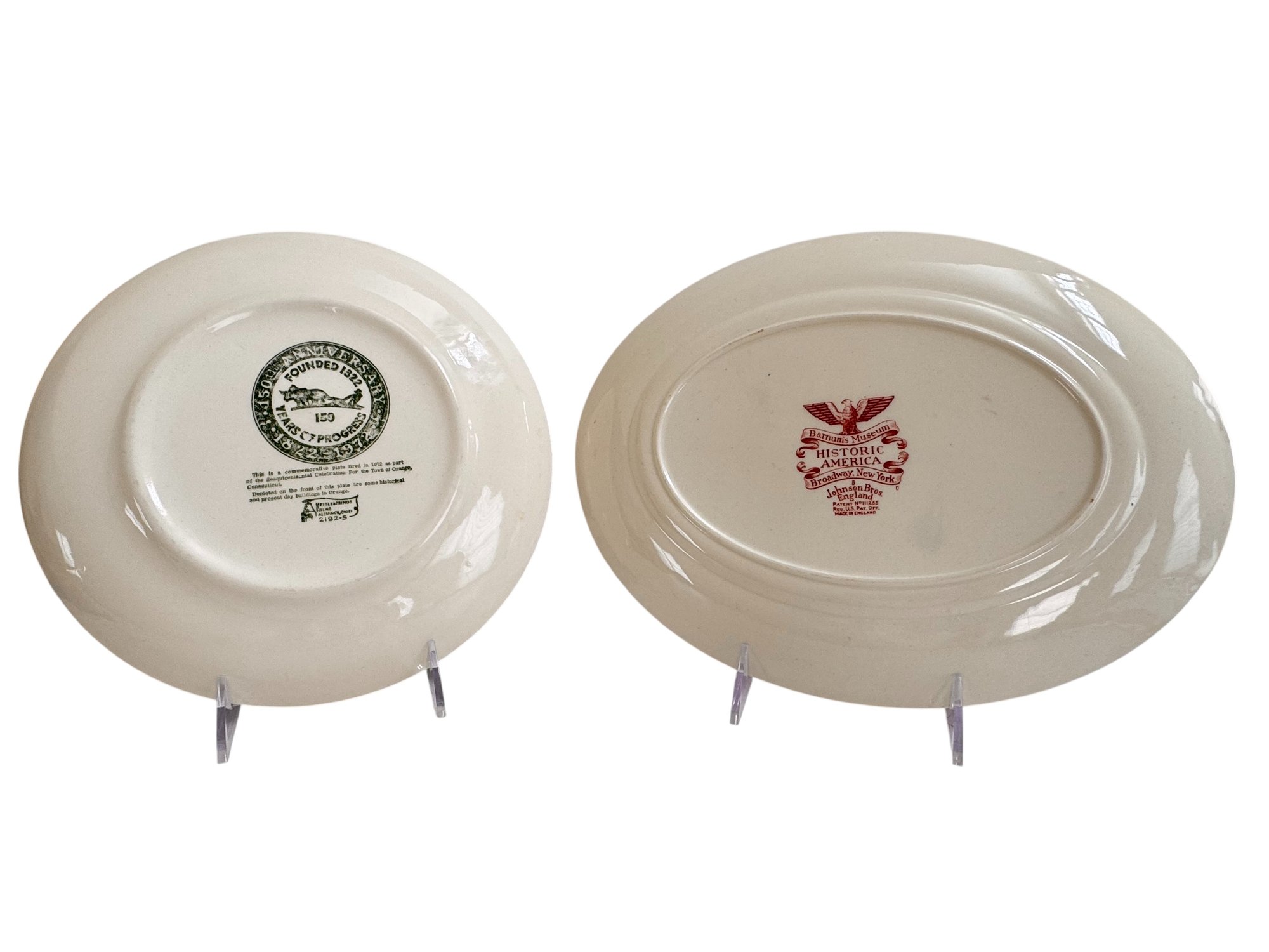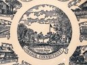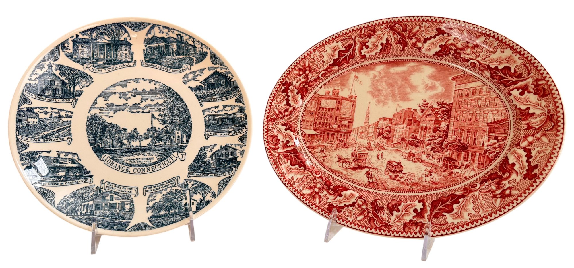 A charming pair of vintage decorative plates featuring detailed historic transferware scenes.