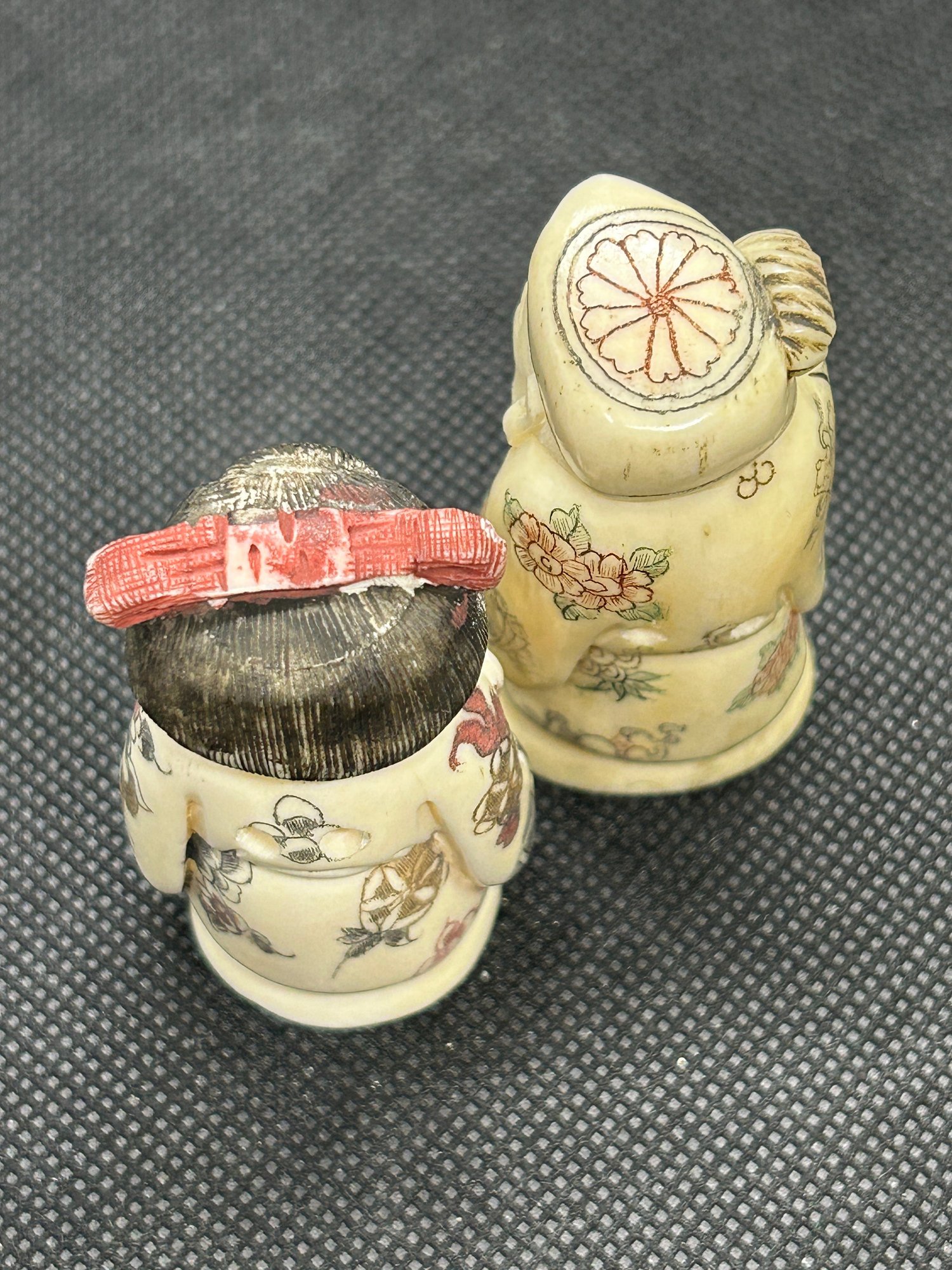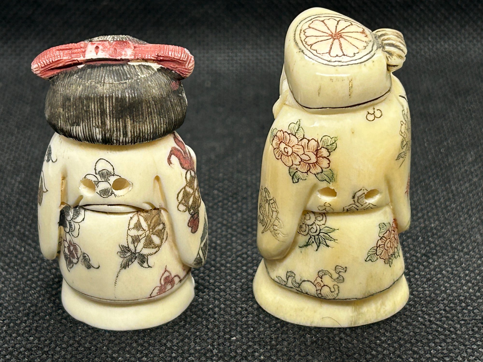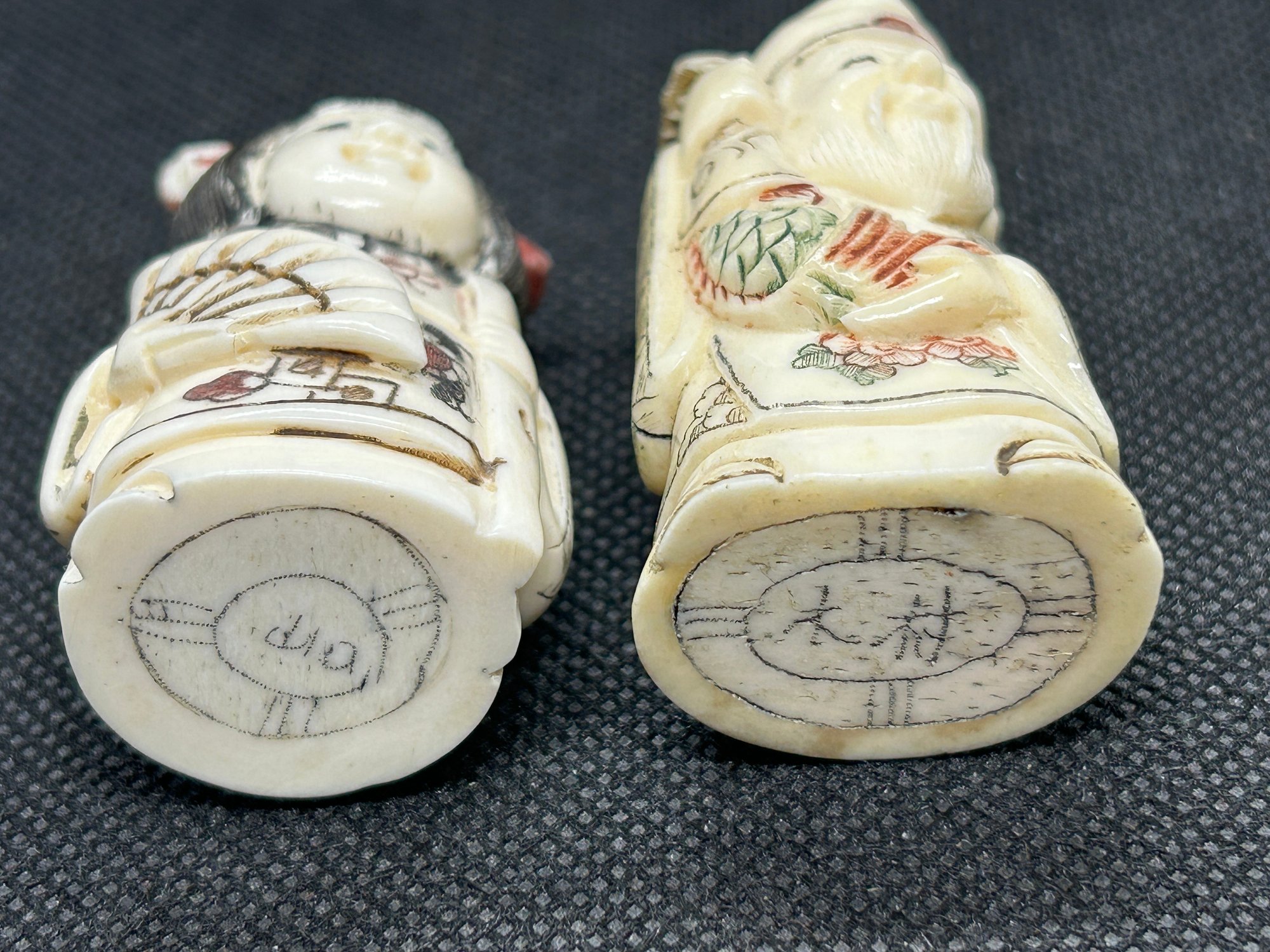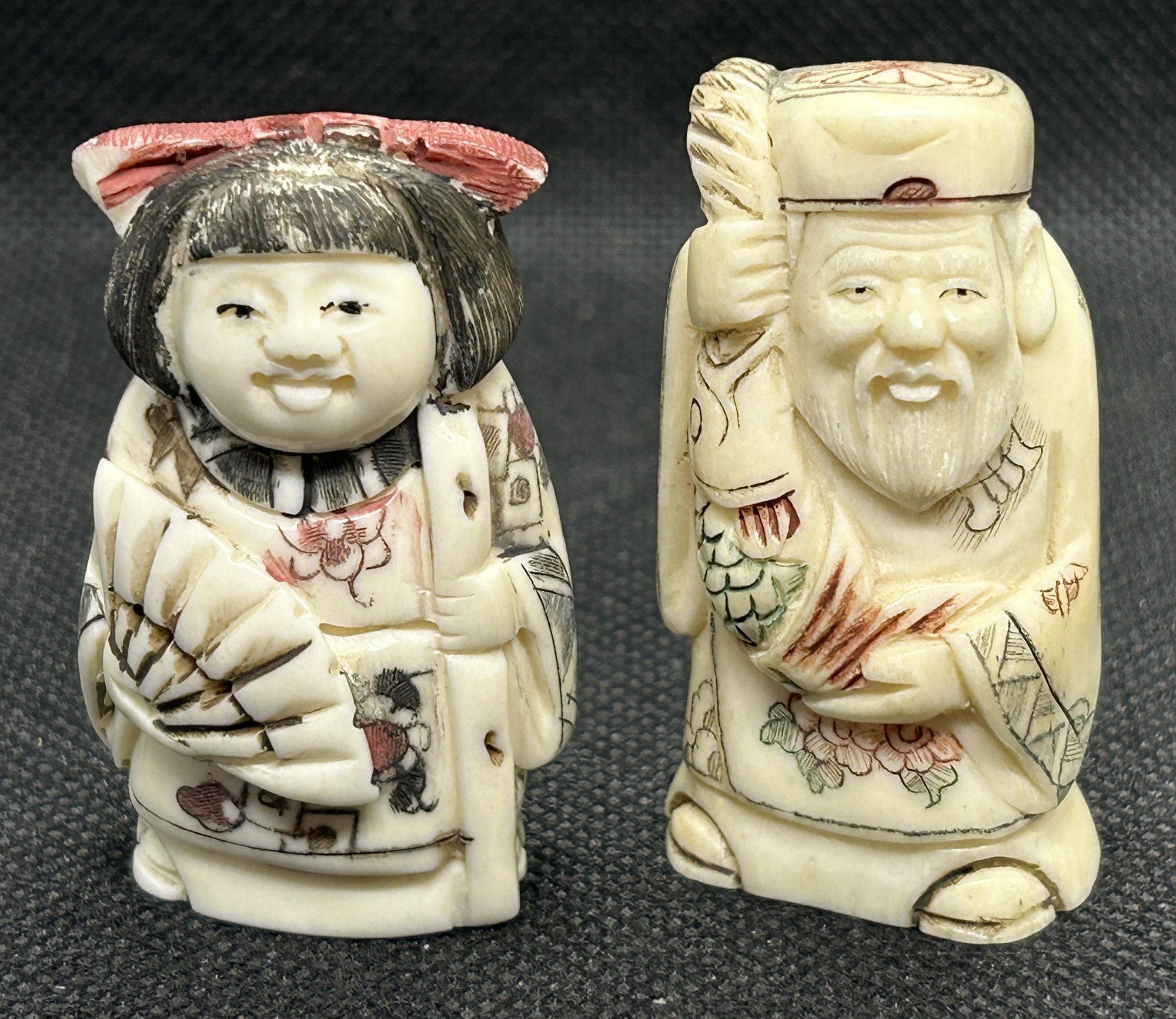 Both are Chinese in origin, in the vein of antique Japanese netsuke. Mid-century bone carvings, a woman with fan and scholar with staff, both artist signed [referred to as NLO or netsuke like objects, often made by talented carvers]. Scant rubbing in spots to the polychrome finish, but in good overall condition.