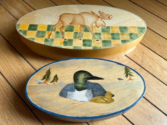 Great pairing, one with a loon with hatchling loonlet. The other, a moose on checkerboard backdrop. Both are in very good condition.