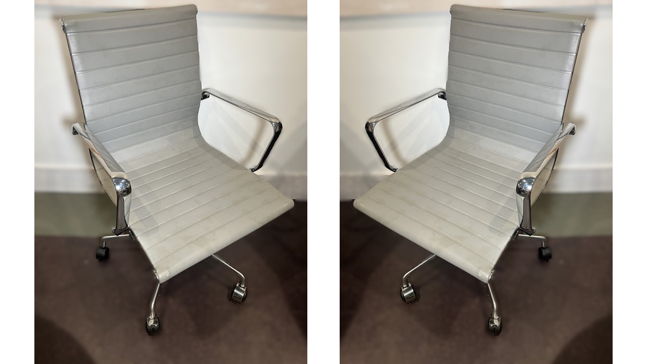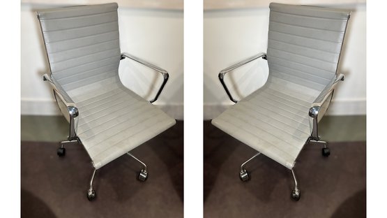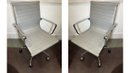 Pair of classic modern design gray faux leather ergonomic adjustable computer/desk chair on wheeled feet with chrome frame. These are inspired by the classic Herman Miller design but are contemporary "similar to" products that still retail for $500 each new even on Amazon. The real deal Herman Miller ones are closer to $2000 per chair.
