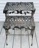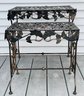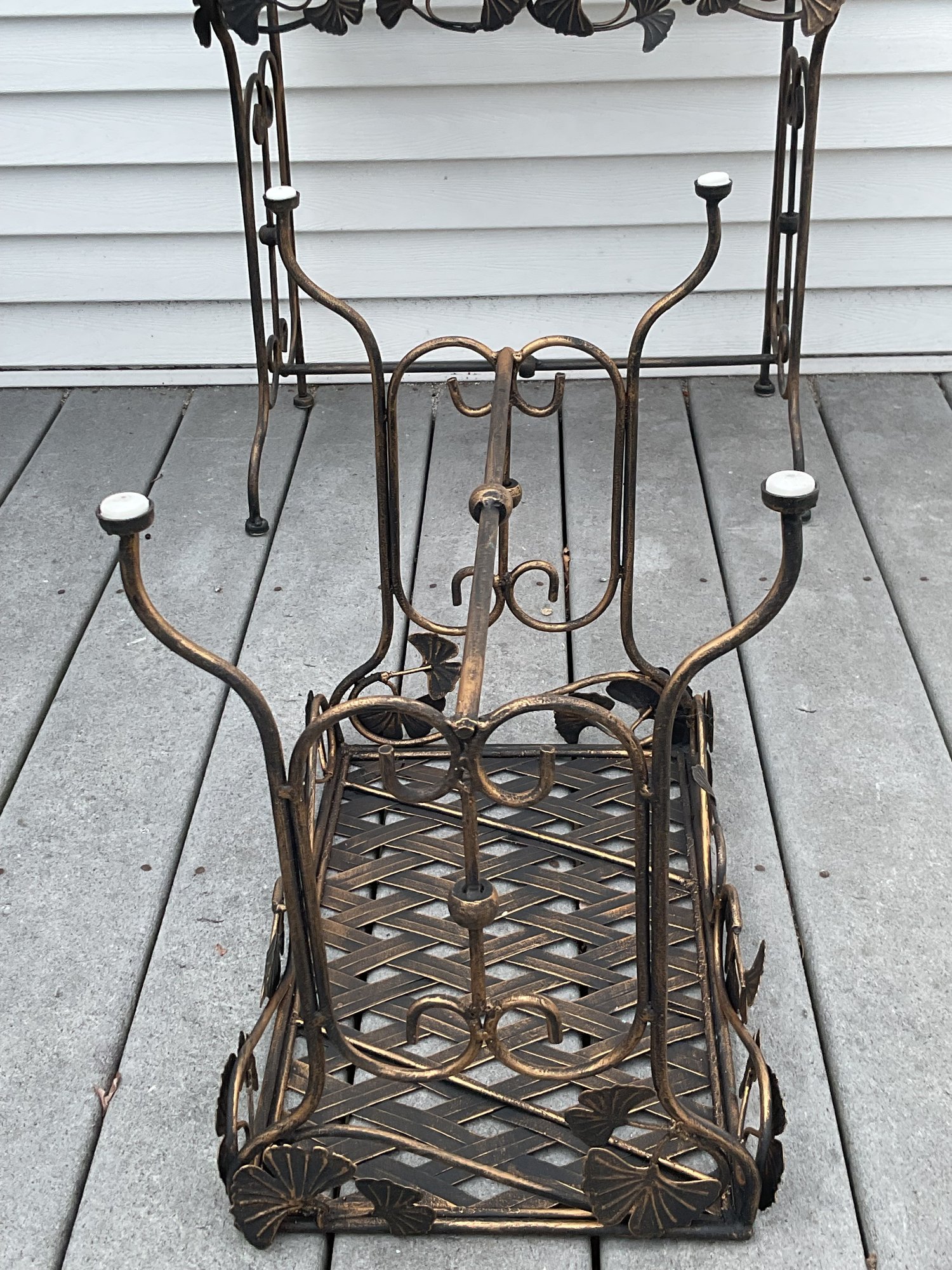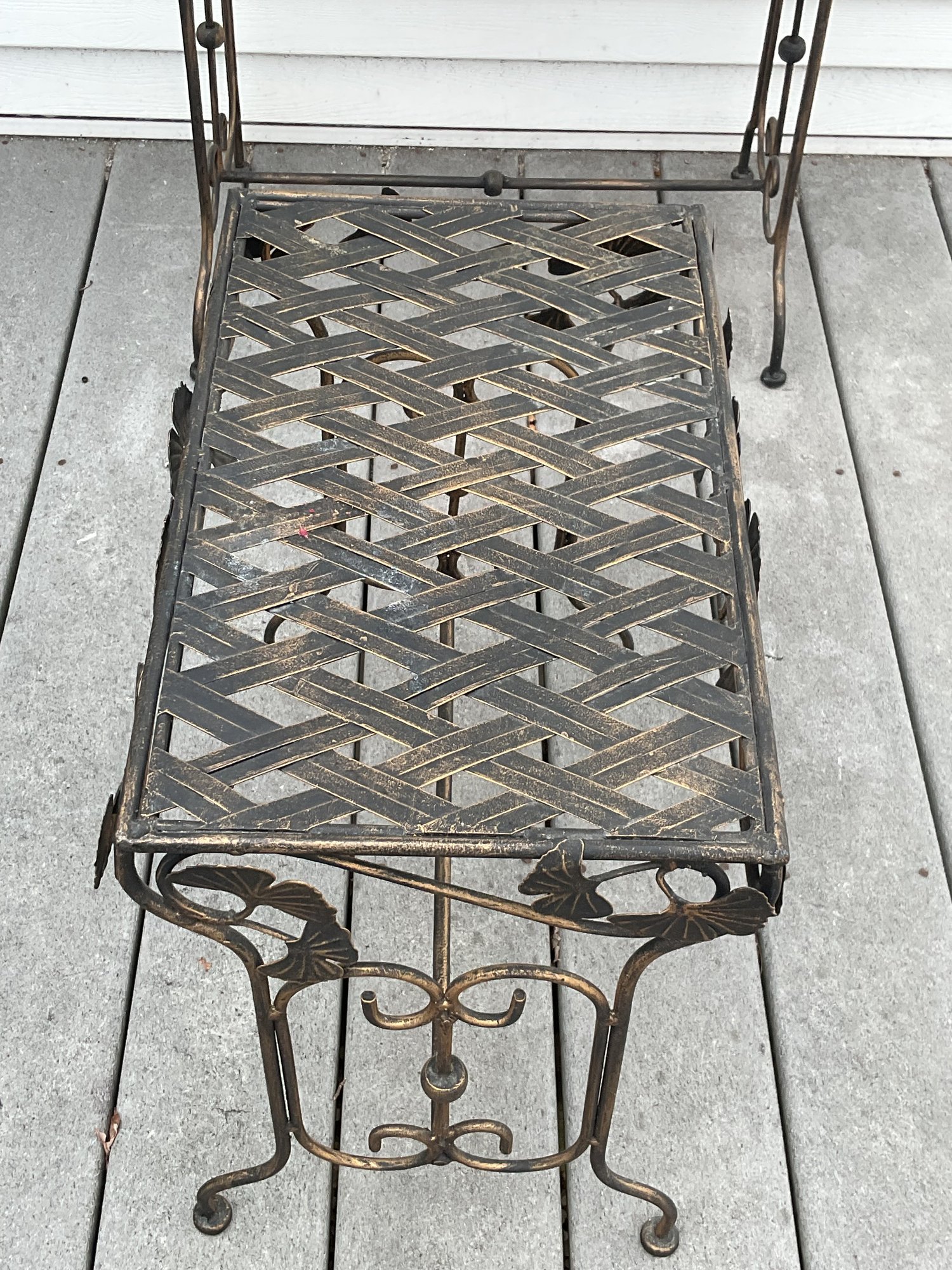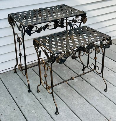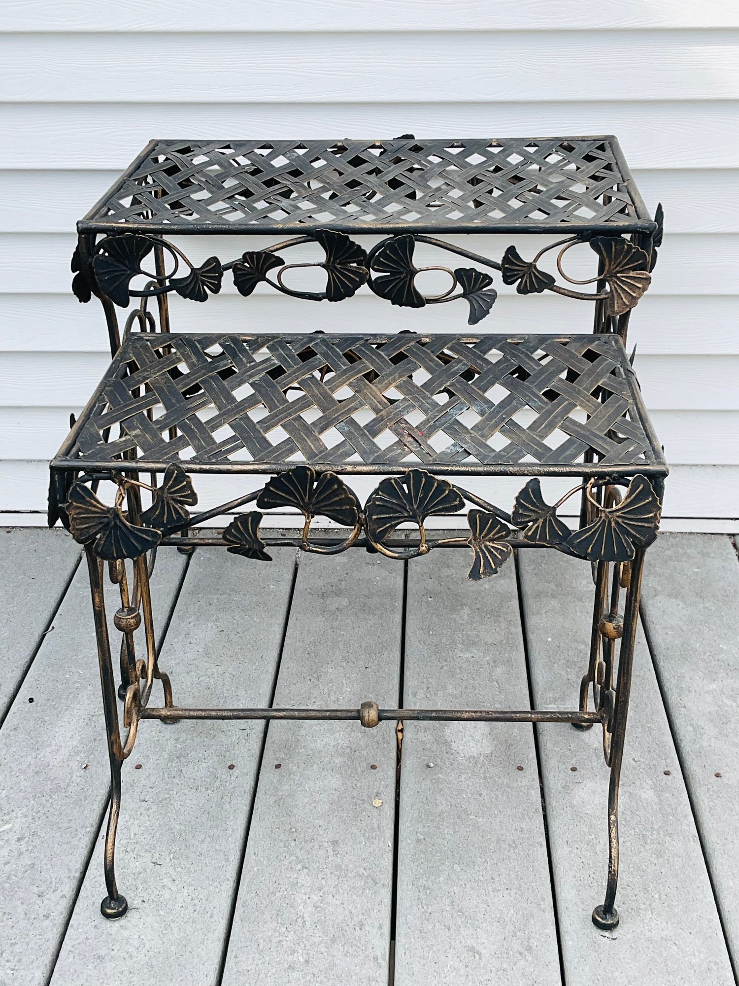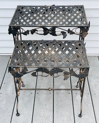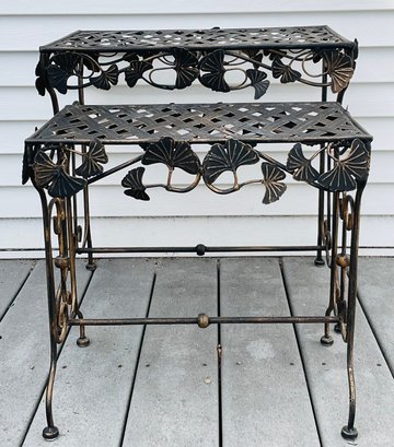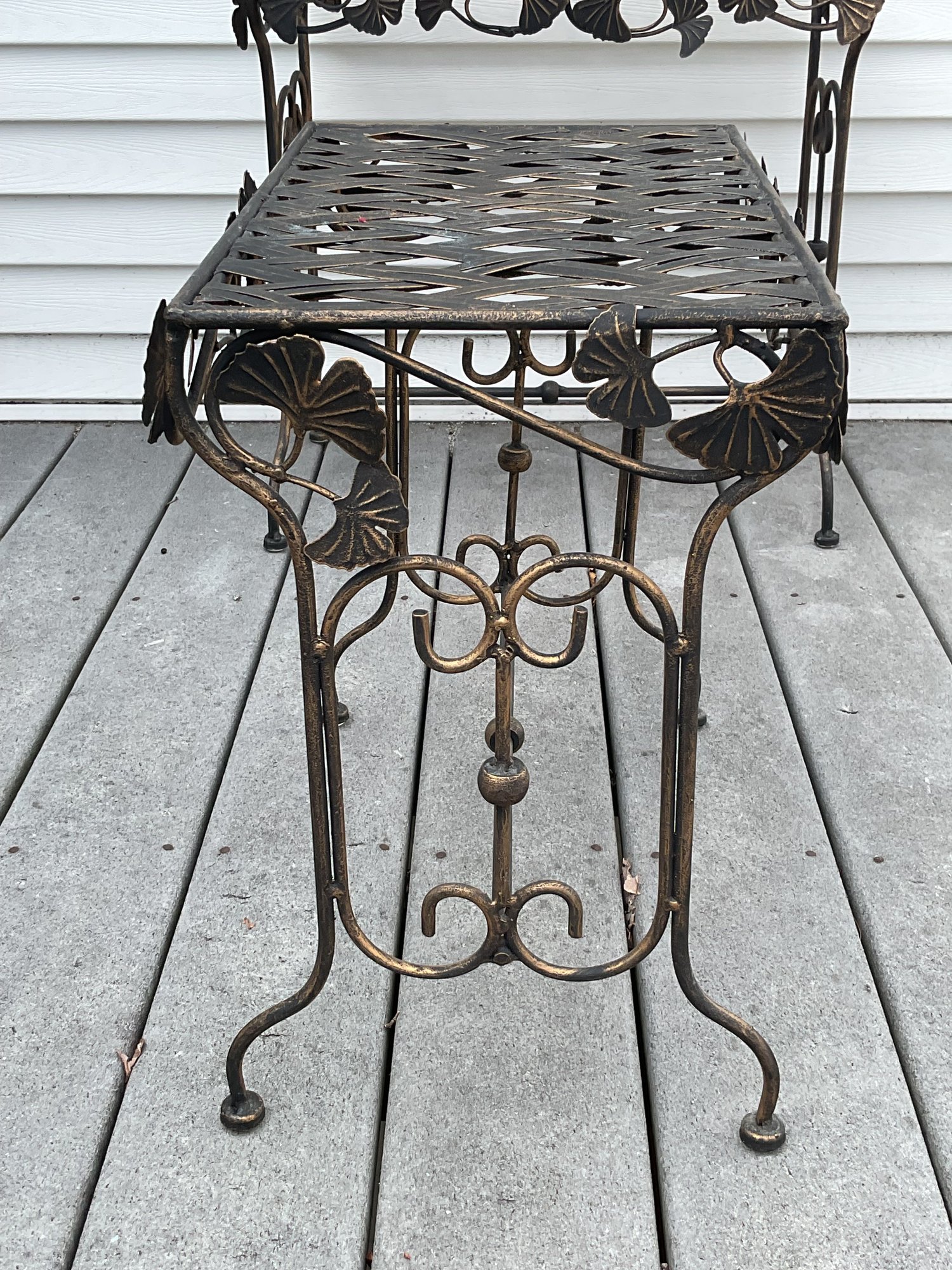 They feature a classic lattice-work top and are beautifully accented with an ornate ginkgo leaf motif throughout the apron. The metal is finished in a sophisticated black with subtle gold-tone highlights, providing an antiqued or "bronzed" aesthetic that complements both indoor and outdoor spaces.