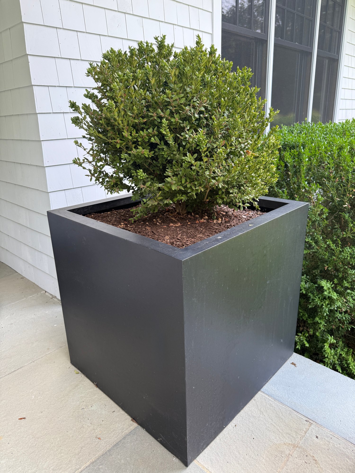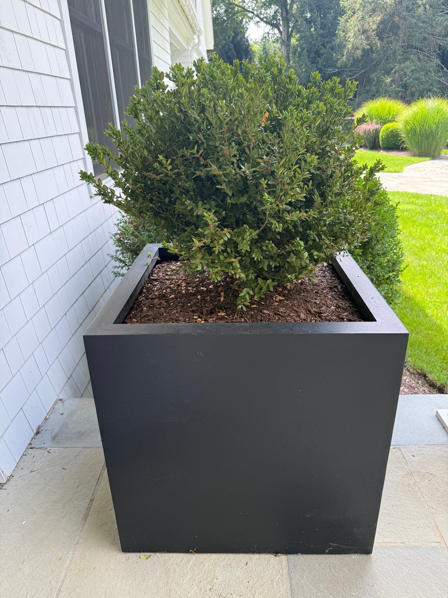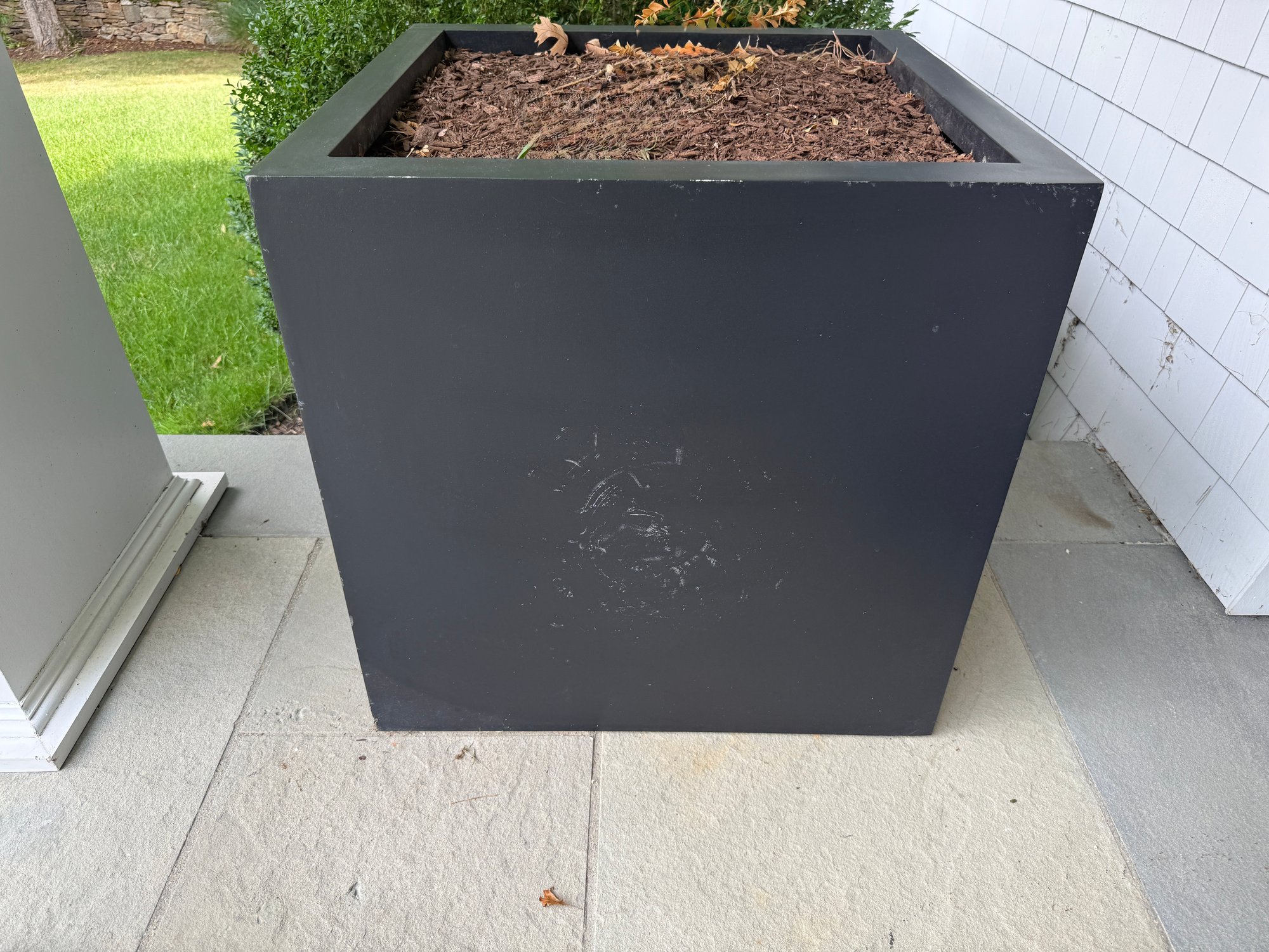 1 has a boxwood and one has no plant. Some light wear (in photos), could benefit from a cleaning. Composite material.