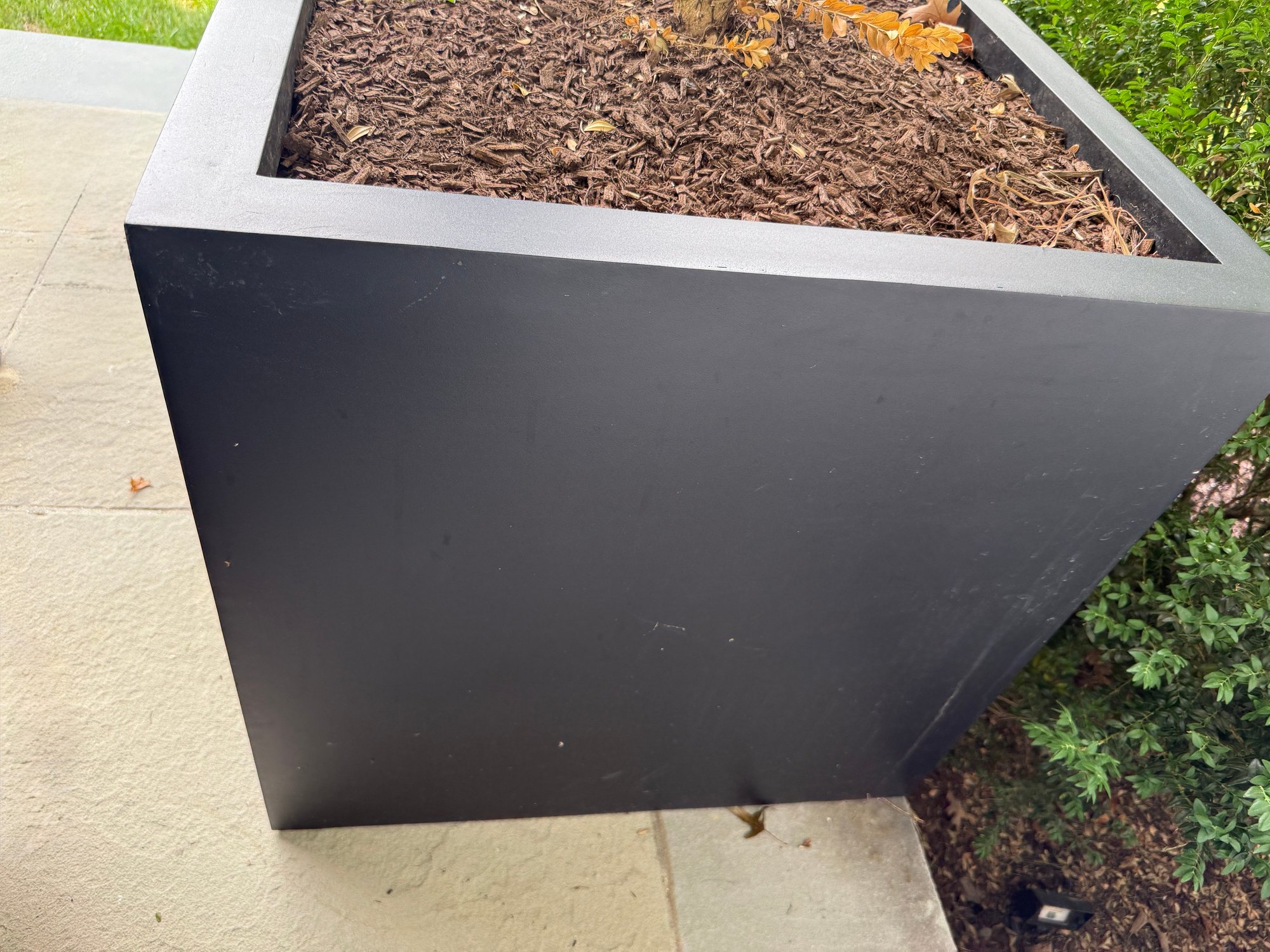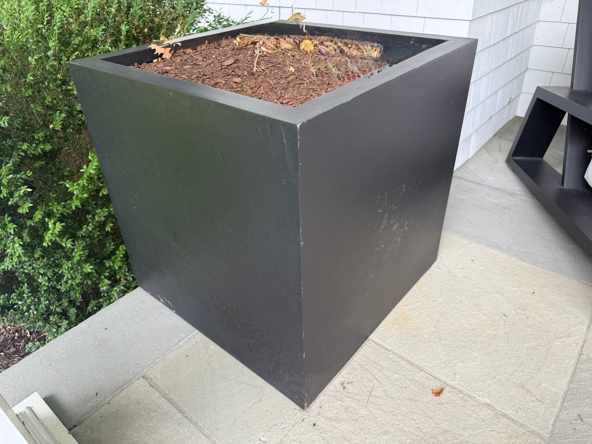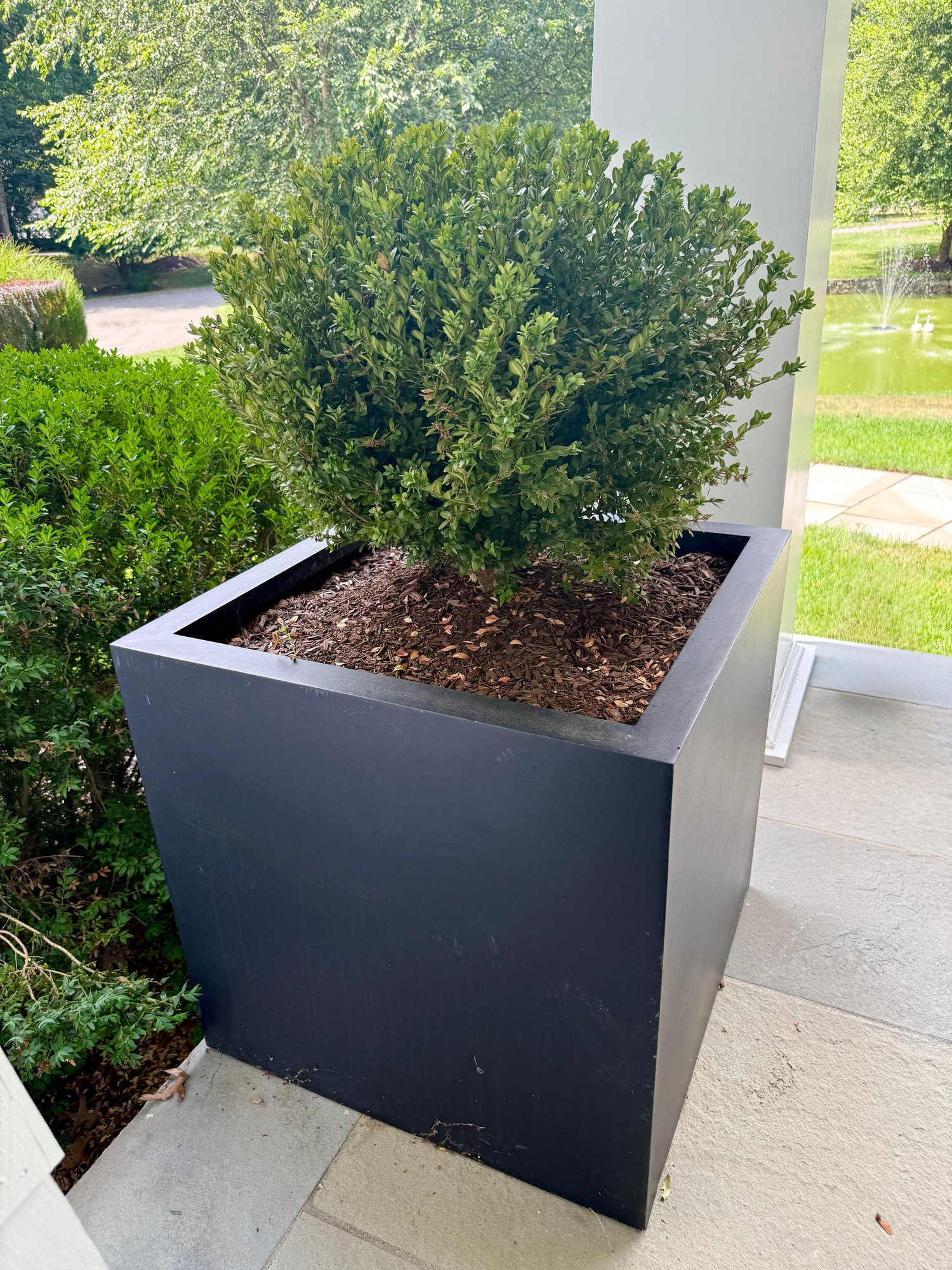 1 has a boxwood and one has no plant. Some light wear (in photos), could benefit from a cleaning. Composite material.