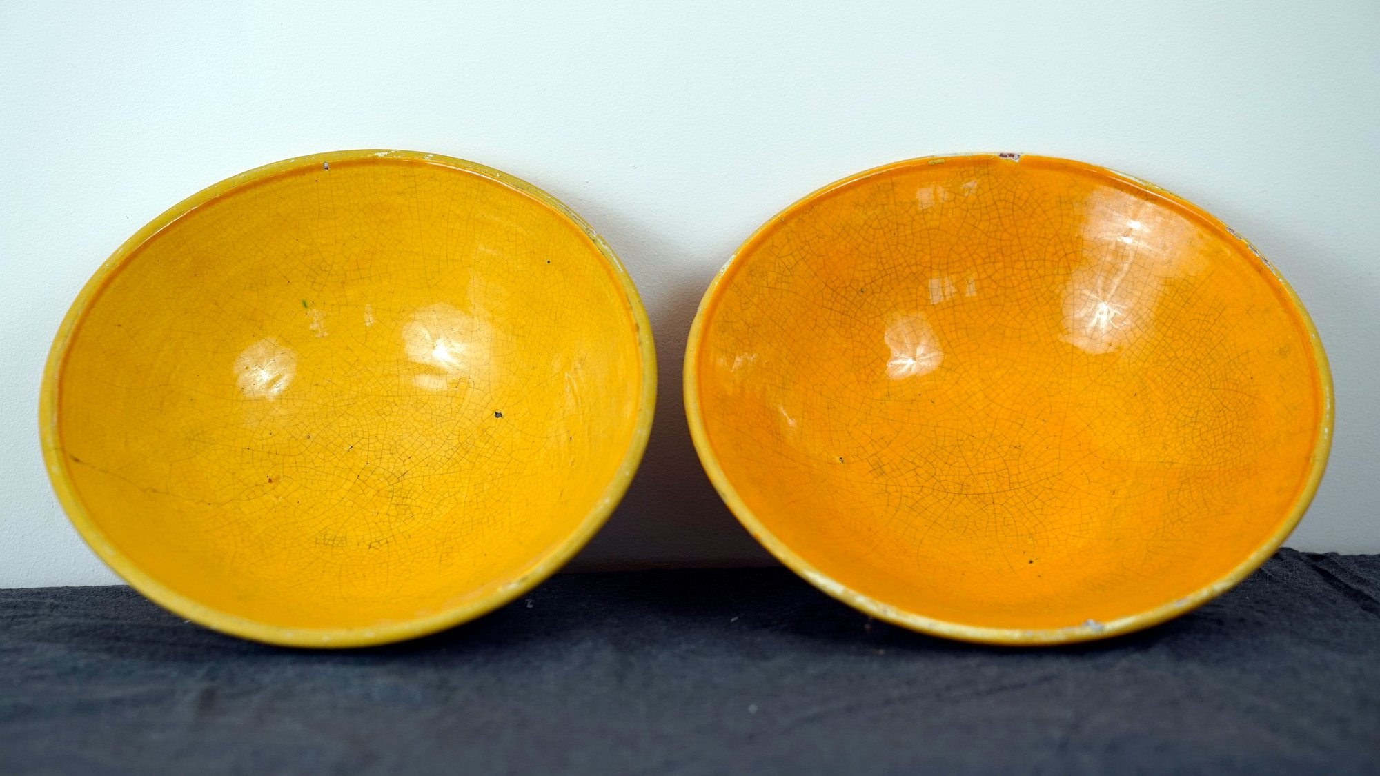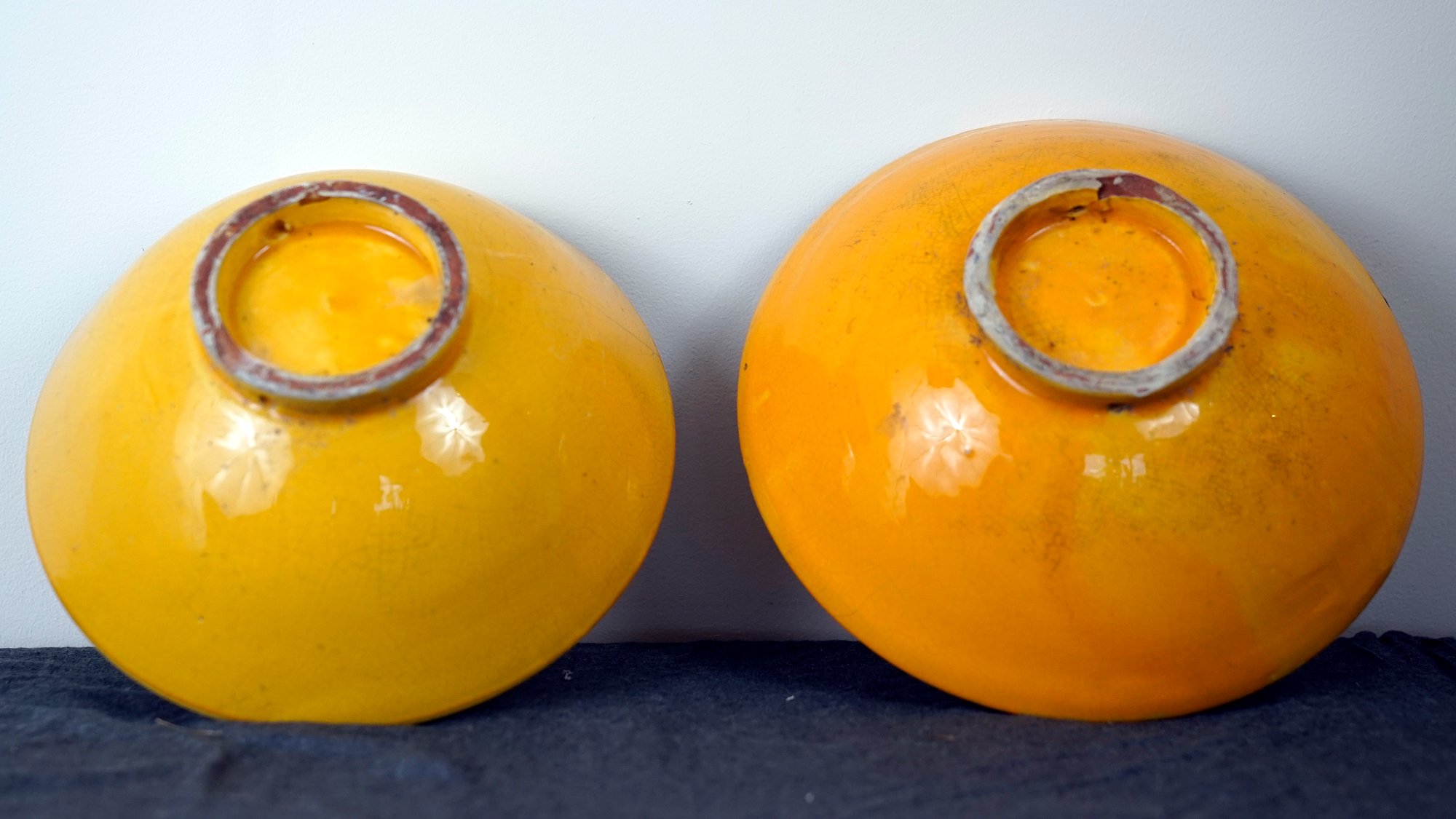 Chips and hairlines. One hairline is cracked type, others are on surface enamel.