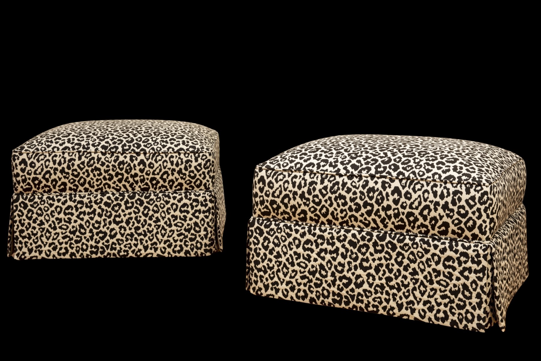 Stylish and versatile pair of upholstered ottomans featuring a bold leopard print fabric. Neutral palette with black and beige tones to complement a variety of interiors. Skirted base with concealed casters.