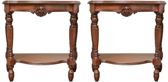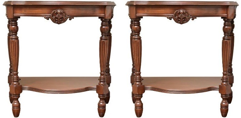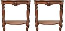 Ornate mahogany-finished tables featuring a molded rectangular top over a carved scrolling cartouche apron, raised on turned and fluted legs joined by a shaped lower shelf, in a traditional Victorian revival style.