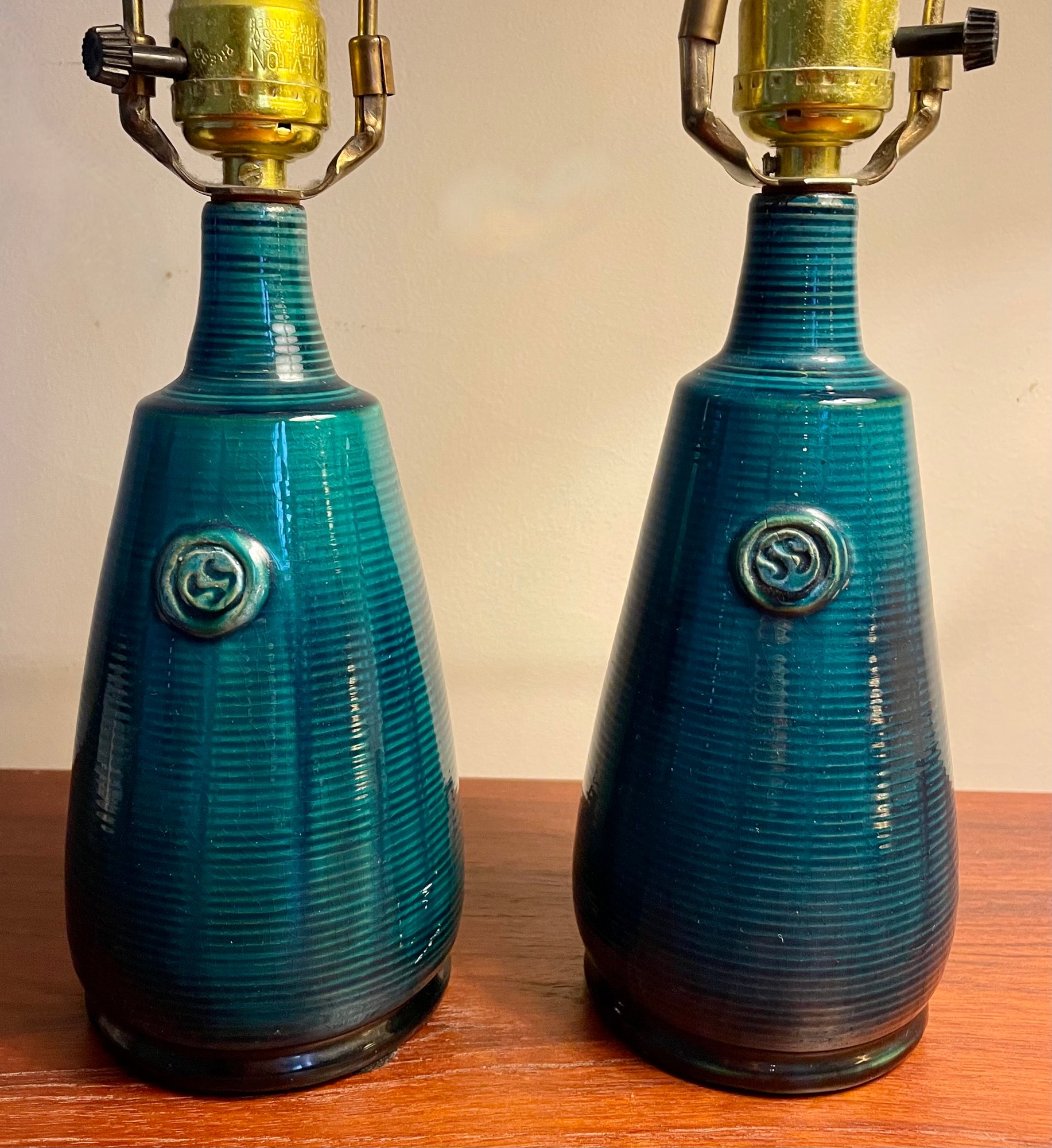 A pair of lamps with a striking blue glaze. They have the initials SS on the two lamps and I haven't found out if that is a maker, or a design. Nonetheless, they are a very attractive pair , in very good condition, and work well too. The base is 8" tall and the total height is 21 1/2".