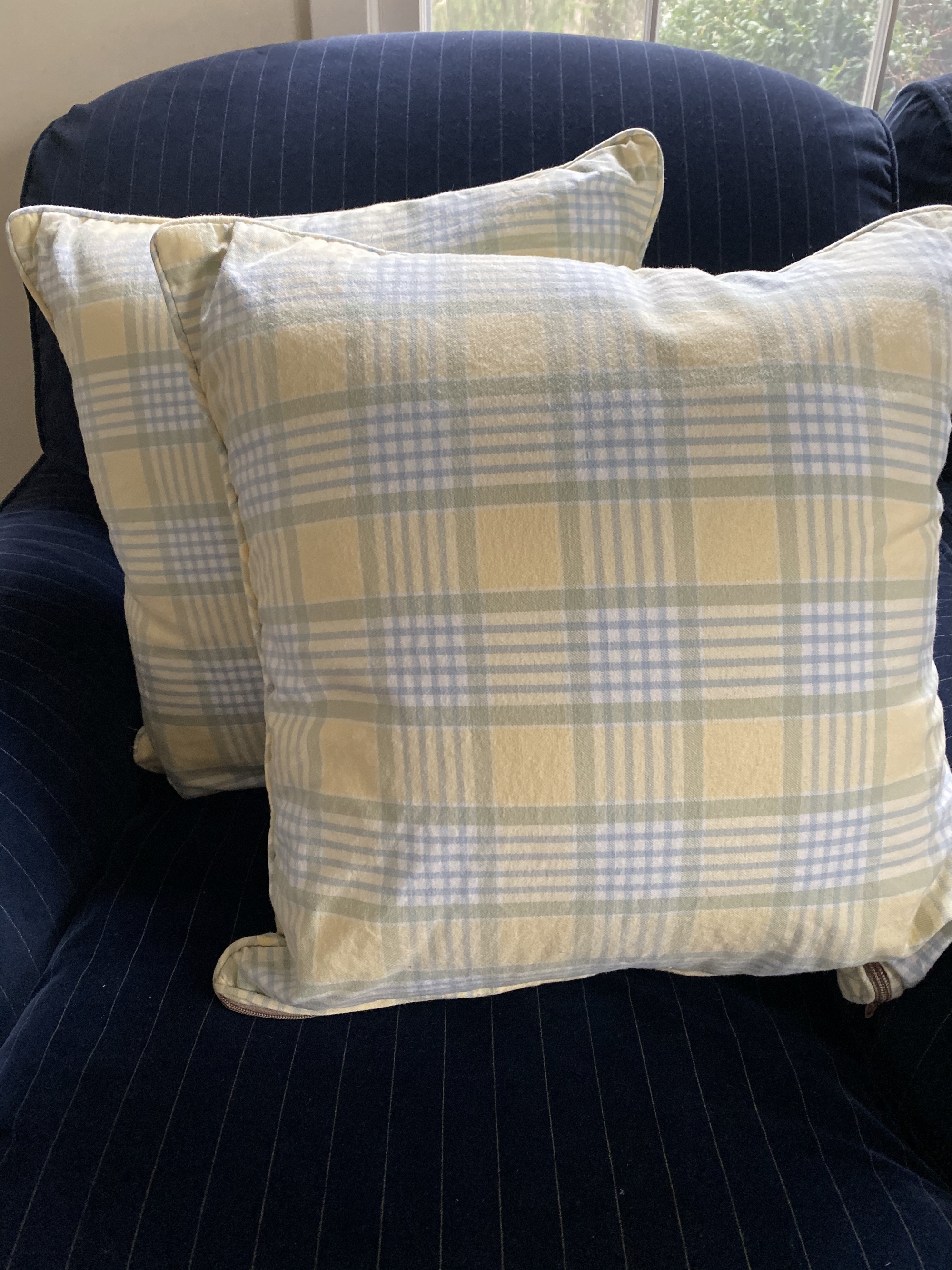 Classic light blue, green and yellow plaid fabric. Pair of two. Pipe welting.