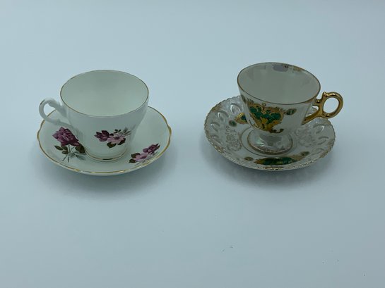 Sweet pair of unmatched tea cups and saucers. The first is a lusterware set from Japan with pierced saucer, dark green design and hand painted gold trim - excellent condition. The second is bone china - Royal Ascot, made in England in a pretty purple floral motif, also in excellent condition. No chips cracks or repairs found