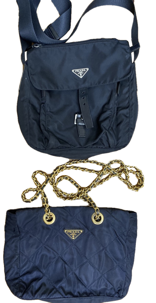 Small navy tote with gold chain straps. Black crossbody with buckle. See photos for condition and details.