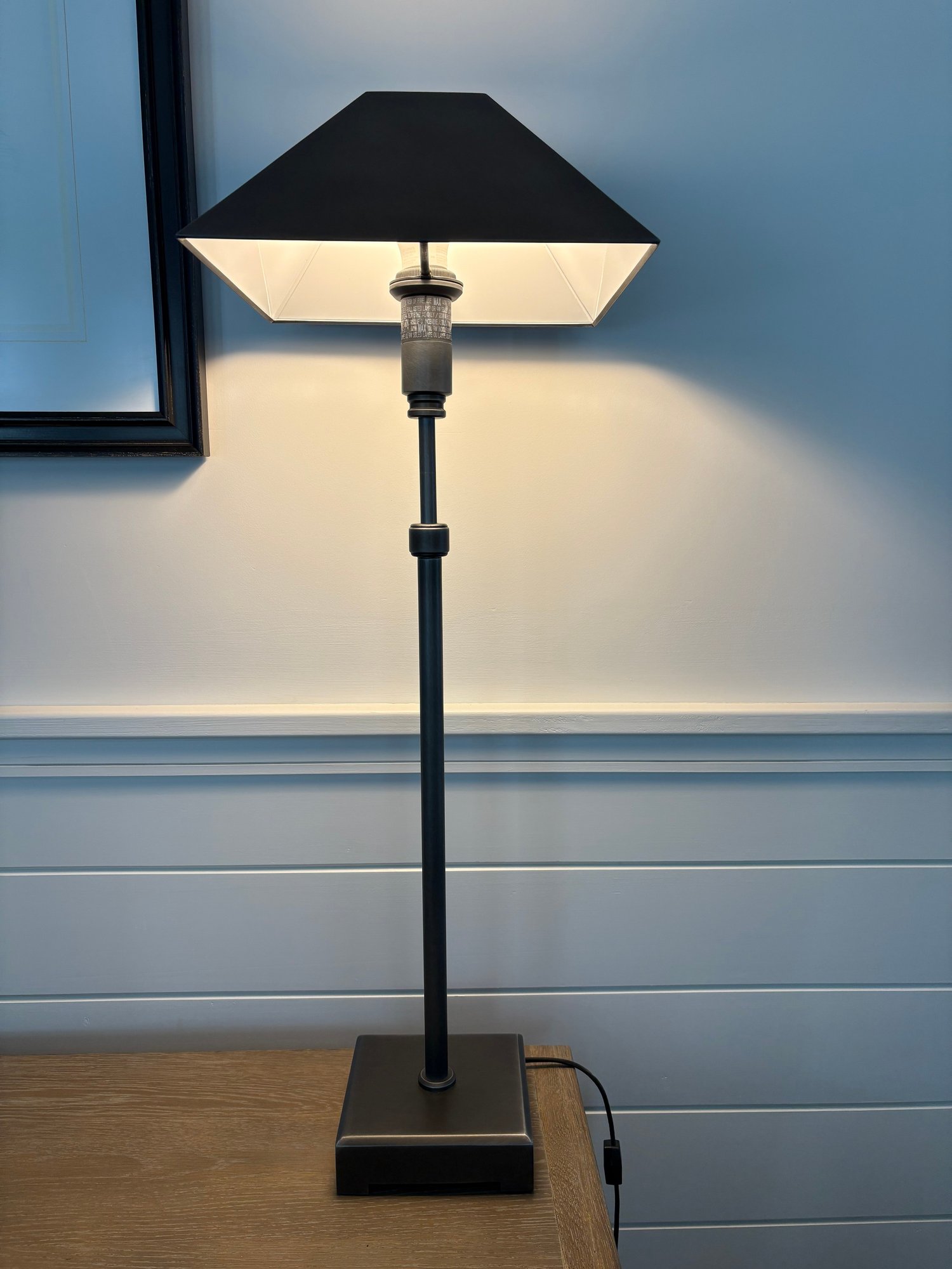A study in geometry, these lamps pair a substantial square base with a pyramid shade. A telescoping design adjusts its height, offering versatility in a range of settings. Topped with a metal shade to focus light.