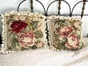 Sweet pair of matched needlepoint throw pillows with a rose design lined with pom-pom fringe.