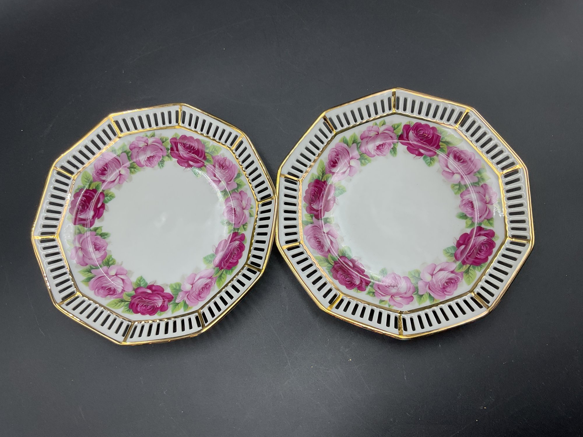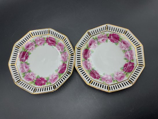 Gorgeous vintage Schumann Germany pierced plates in the 10 point Melrose pattern. Both in excellent condition with bright clear painting and hand painted gold trim appears unworn. Based on the mark, we believe these may be 1930's-40's vintage. These sell online for approx $40 each!
