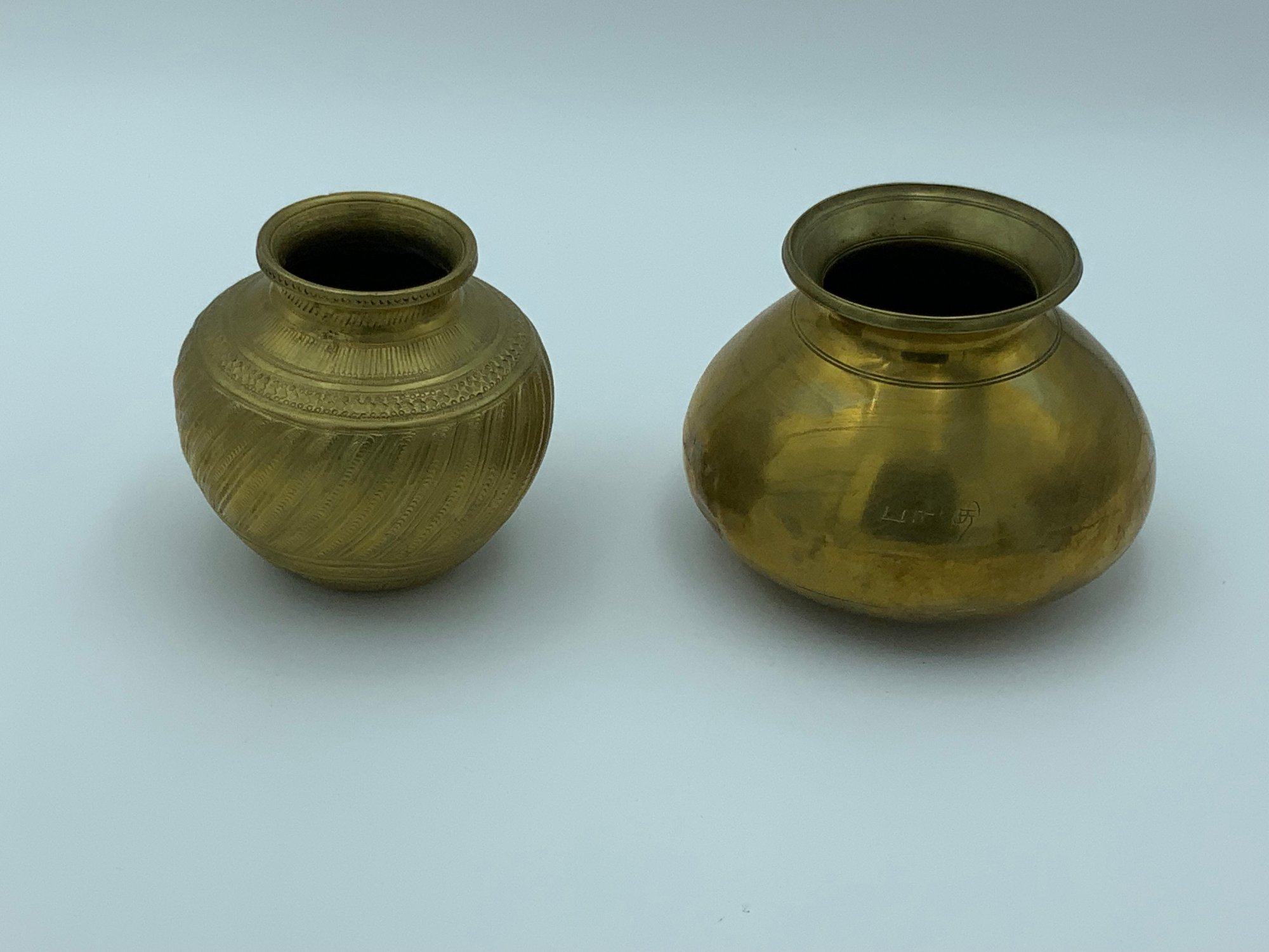 Two different style handmade vintage brass pots, brought from India by the owner's family and displayed in their home for many years. One is highly decorated with an all over striped motif. The other is more simple but is a unique shape with some writing (?) on one side. Both have wear consistent with age and use.