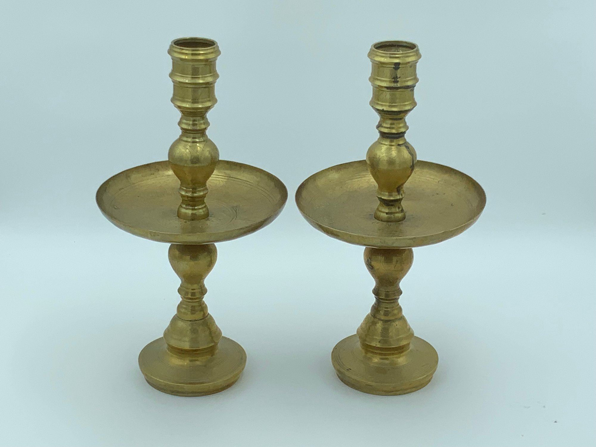 Fabulous brass altars brought by the family from India and used to honor the gods over the years, these altars are intended to hold a central candle with a tray to hold dishes with small offerings. Elaborately detailed with lots of engraving. The top and bottom parts can unscrew to remove the tray and can serve as large candlesticks. Very good vintage condition with wear consistent with age and use