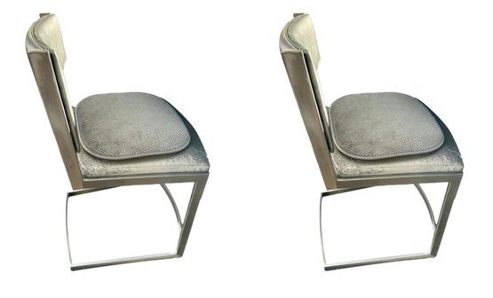 A sleek foundation for your next design project, this pair of brushed metal low stools offers a sturdy and stylish frame perfect for reupholstery (refer to condition note below). Currently upholstered in a high-shine silver faux leather, these stools feature a slightly curved back with layered detailing, a plush seat cushion, and a substantial metal frame. The cantilevered base is elegantly sculpted, featuring a squared-off, open-form silhouette that gives the stools a floating appearance while ensuring stability.