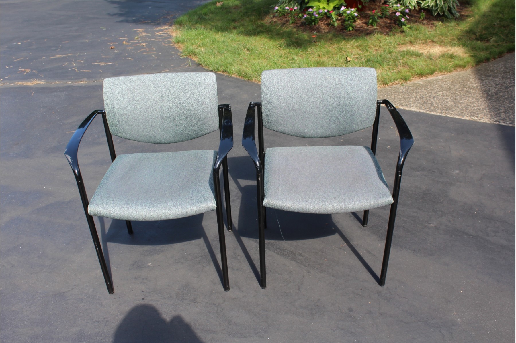 I like the black frame but there are a few scratches with these 2, it is a Leaf design but it is hard to see with these pictures. Additionally, a very nice wood frame desk chair also from Steelcase. Wooden chair is 30"H 24"W, 22"Depth. Wooden chair has slight marking on legs but fabric is clean.