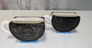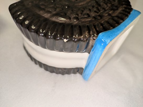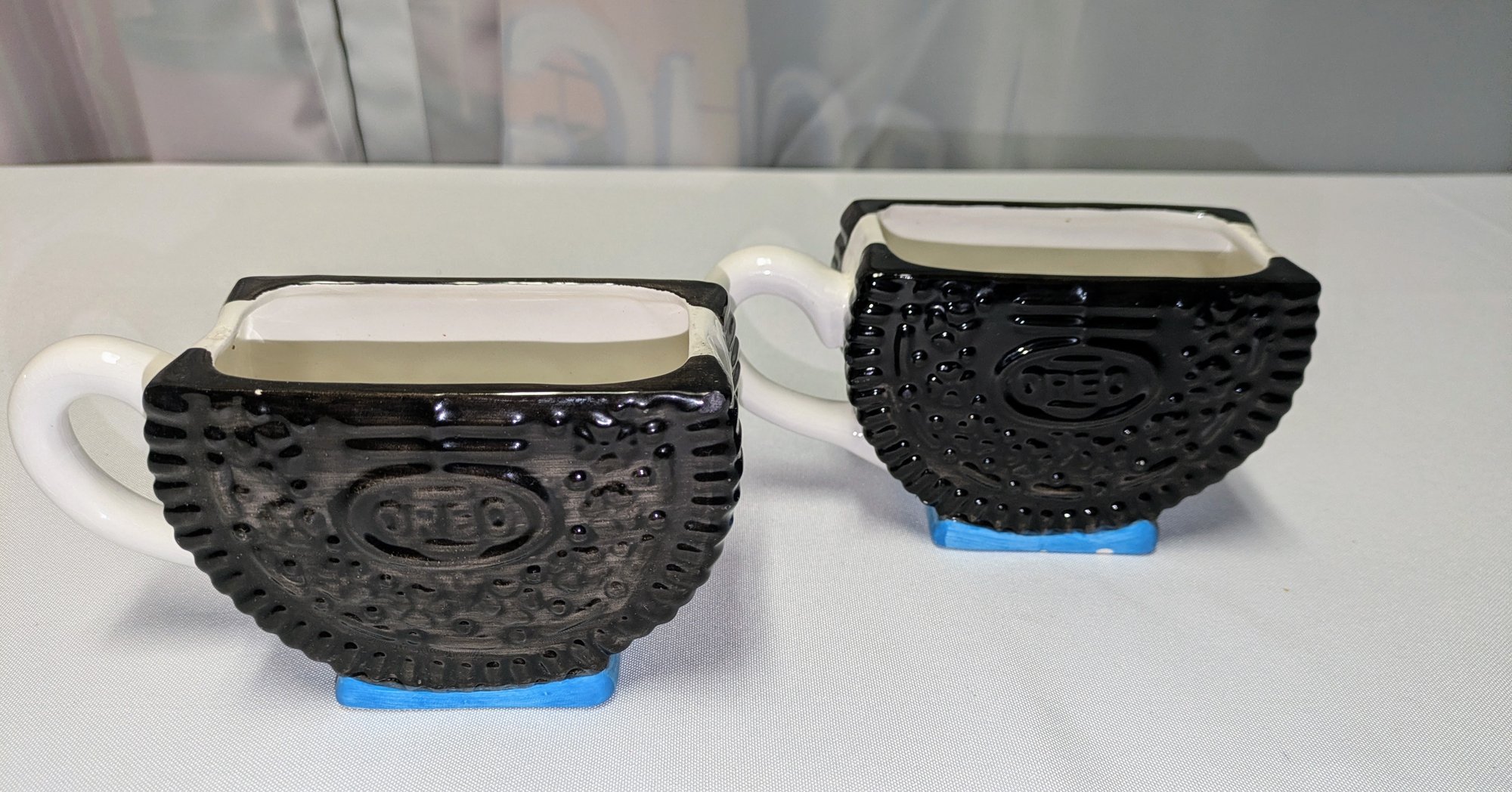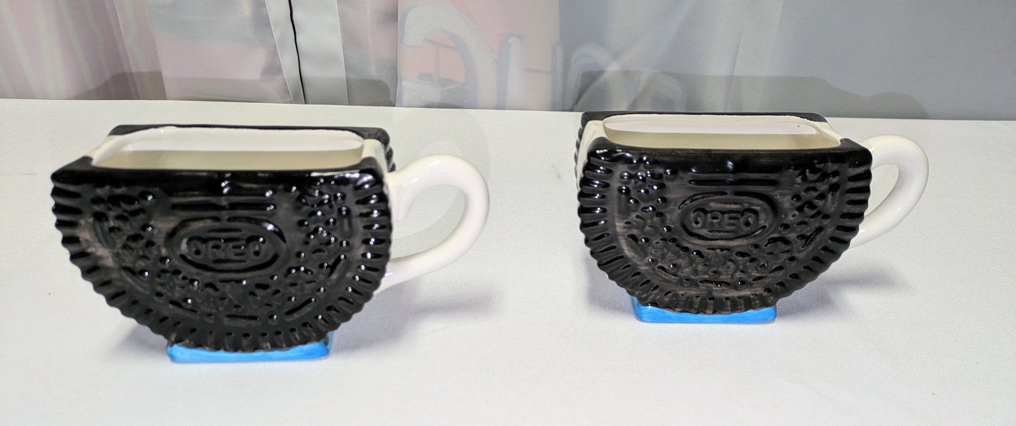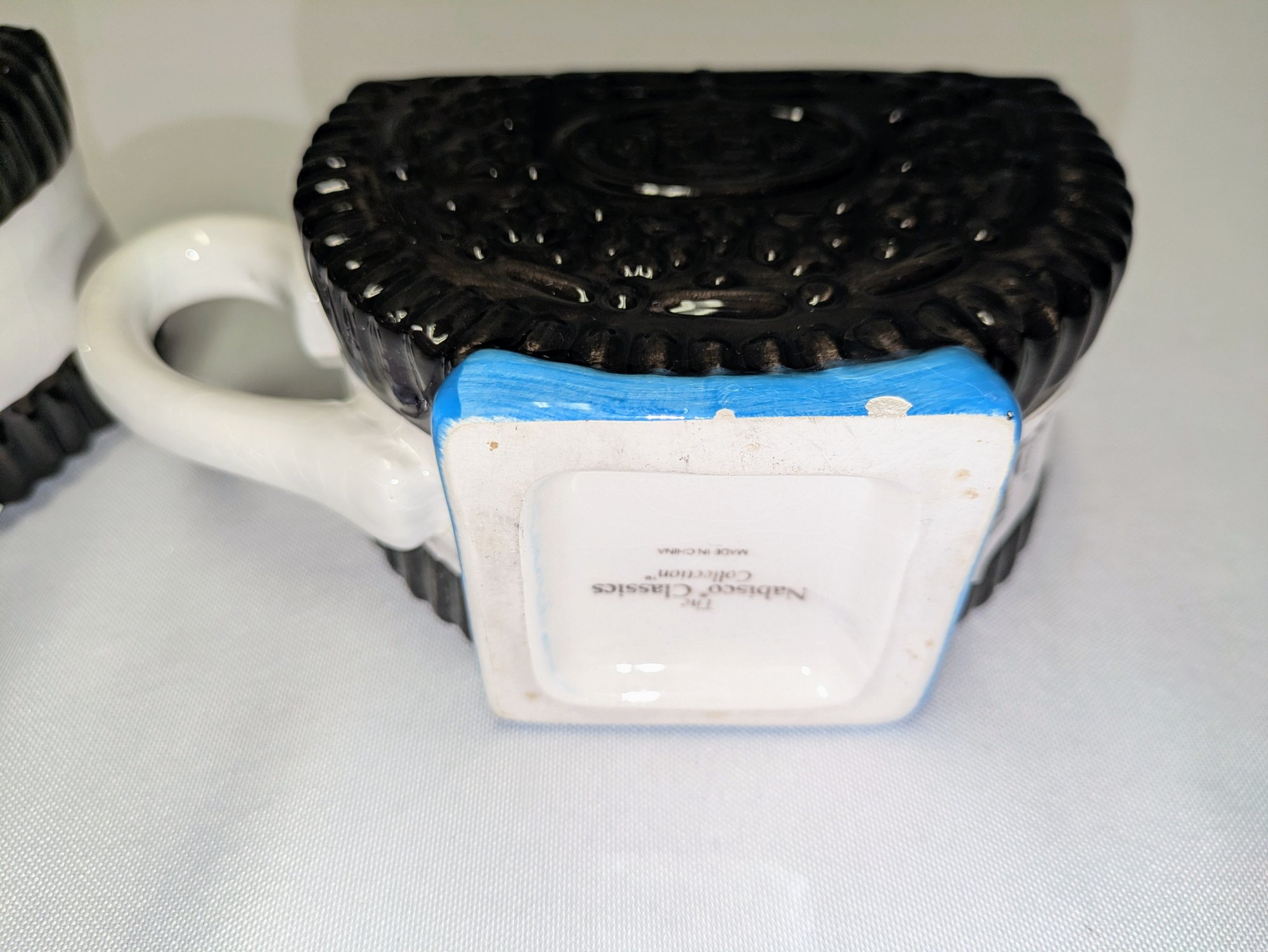Ceramic mugs are shaped to look like Oreo sandwich cookies, complete with textured tops and sides designed to resemble the cream filling. Some marks and small chips are consistent with age and use. One has a stress crack near the top rim over the handle. Please see all photos as part of the description and condition. 3.25"H x 2.5" x 4.5"