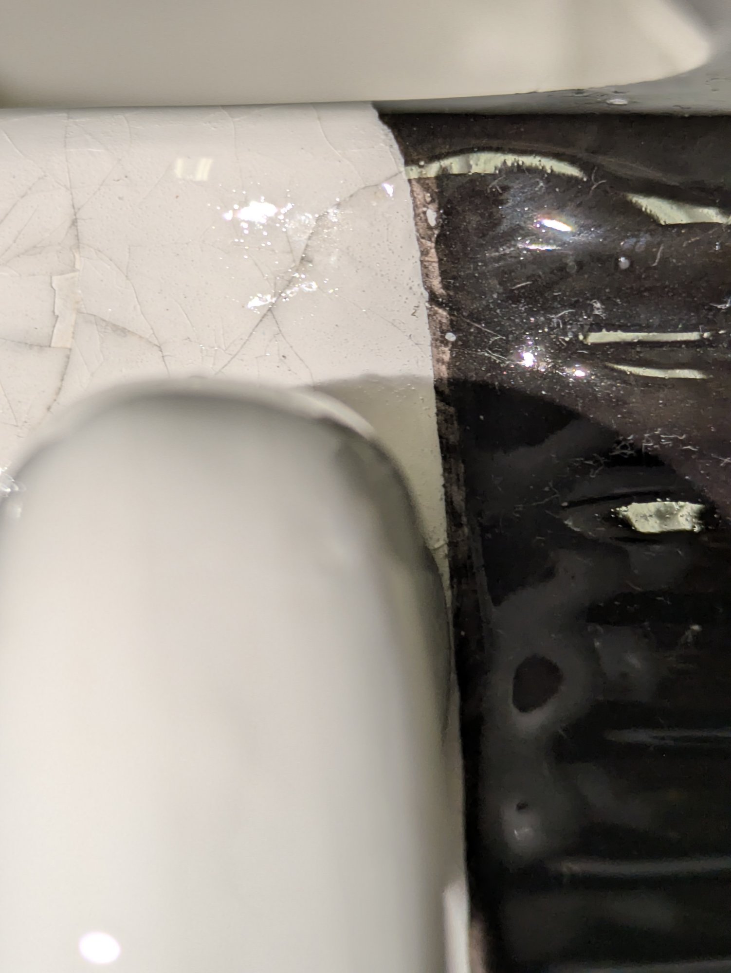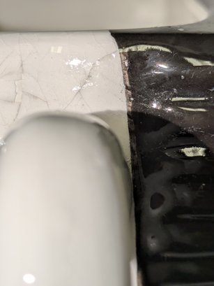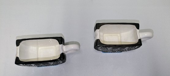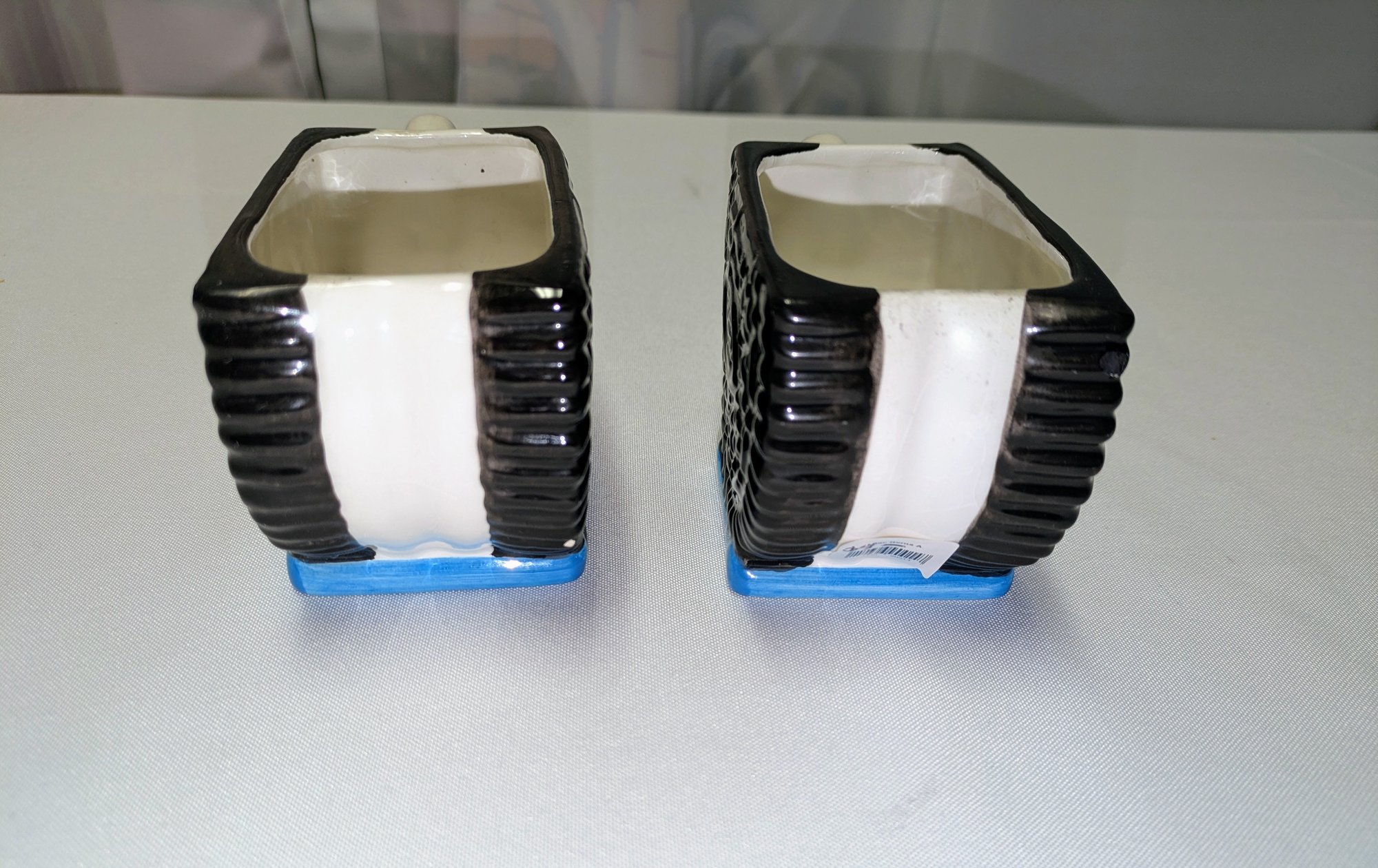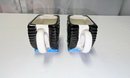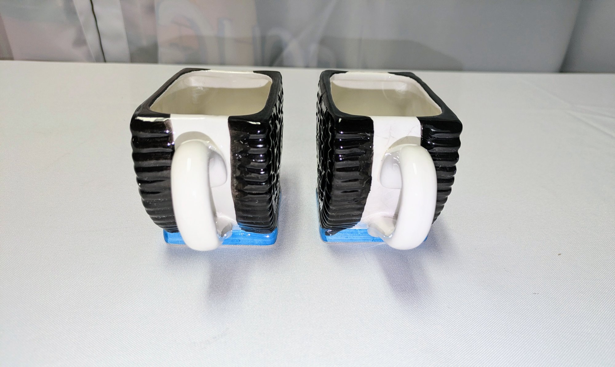 Ceramic mugs are shaped to look like Oreo sandwich cookies, complete with textured tops and sides designed to resemble the cream filling. Some marks and small chips are consistent with age and use. One has a stress crack near the top rim over the handle. Please see all photos as part of the description and condition. 3.25"H x 2.5" x 4.5"
