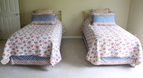 Twin beds with frames on wheels, headboard, bedding (not sheets), decorative pillows, mattresses and box spring are like new.