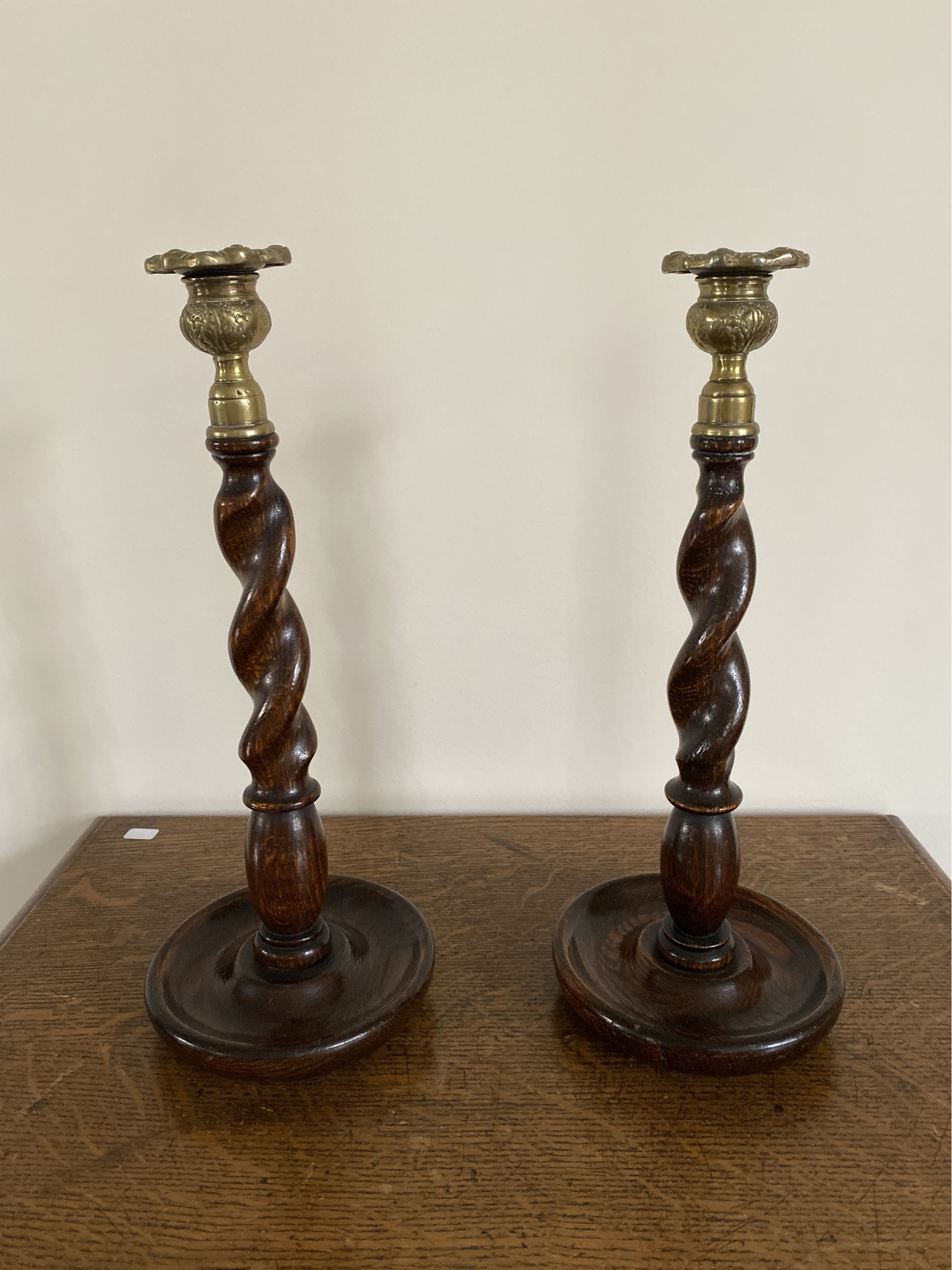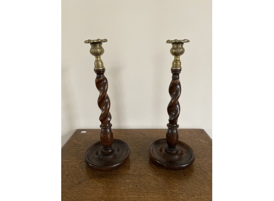 Twisted spindle wooden base candlesticks with intricate brass tops. Each measuring 13" high. Brown felt bottoms.