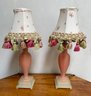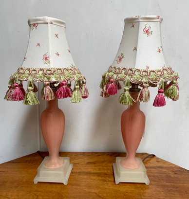 A pair of charming glass table lamps by the Aladdin Lamp Company, marked Aladdin on the base. The lamps come with a pair of fun shades with tassels. These vintage lamps have been rewired so they are in excellent condition in all respects. The height to the top of the bulb is 13 1/4" and to the top of the shade is 14 1/2". The lamps are a lovely dusty pink with an overlay of frosted clear glass.