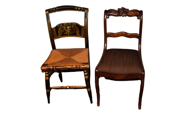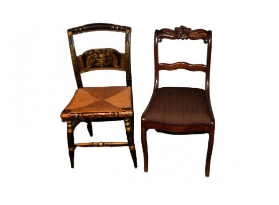 Pair includes, Hitchcock style with rush seat and rose carved chair with upholstered seat